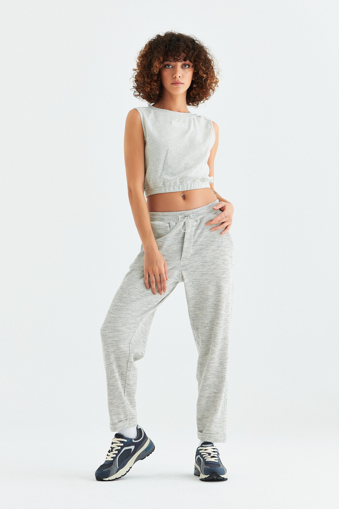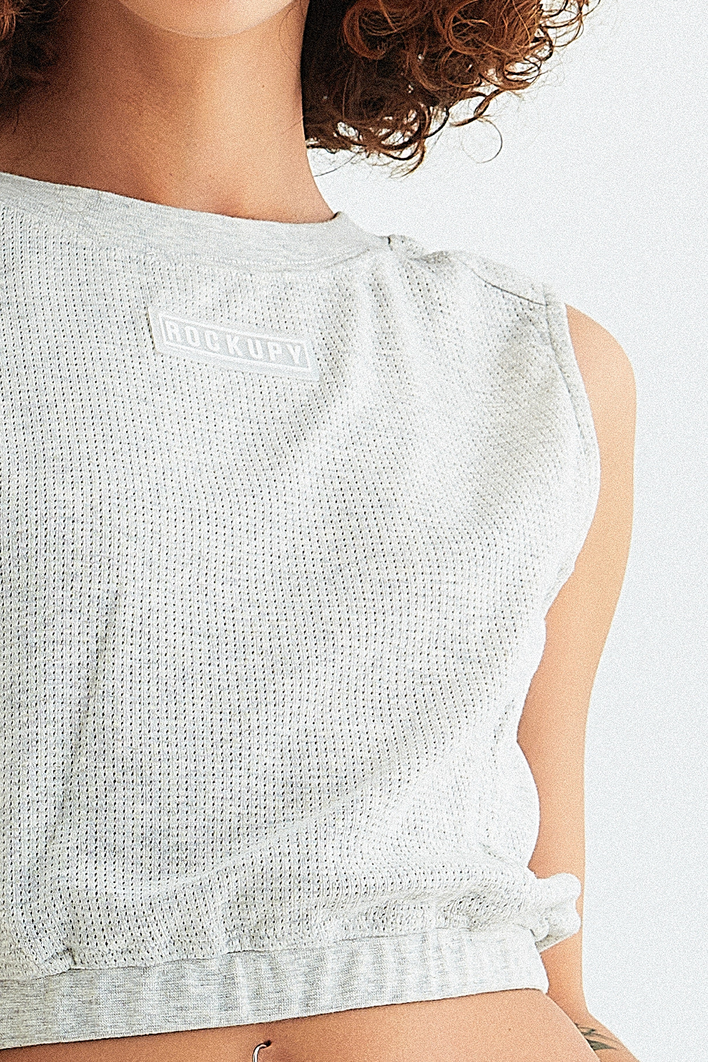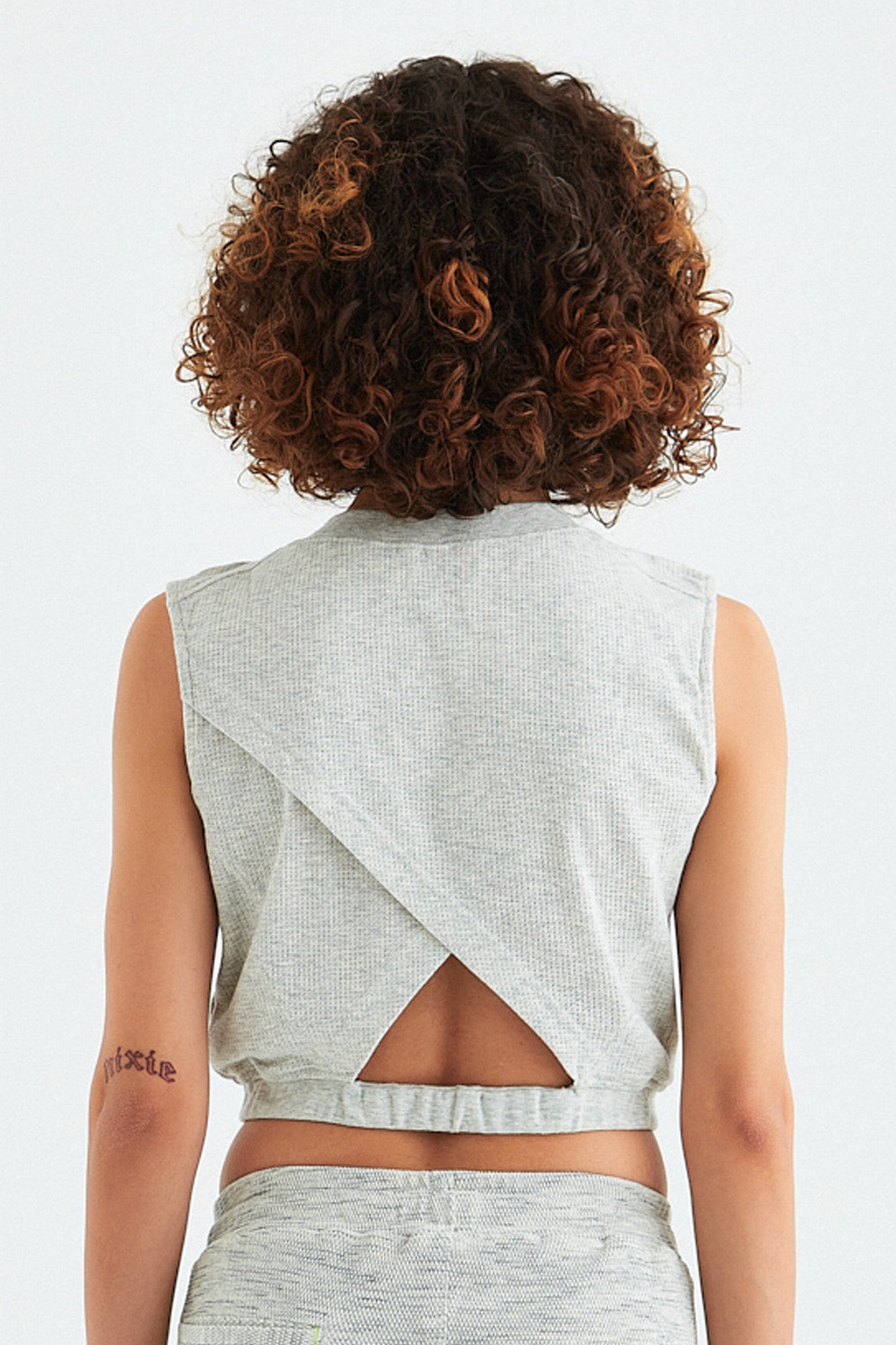 - Strüktürlü yumuşak tuşeli kumaştan kadın crop üst, kolsuz, yakası ribanalı, beli lastikli, arkasında üçgen bel pencereli ve göğüs hizasında orijinal silikon logoya sahiptir.