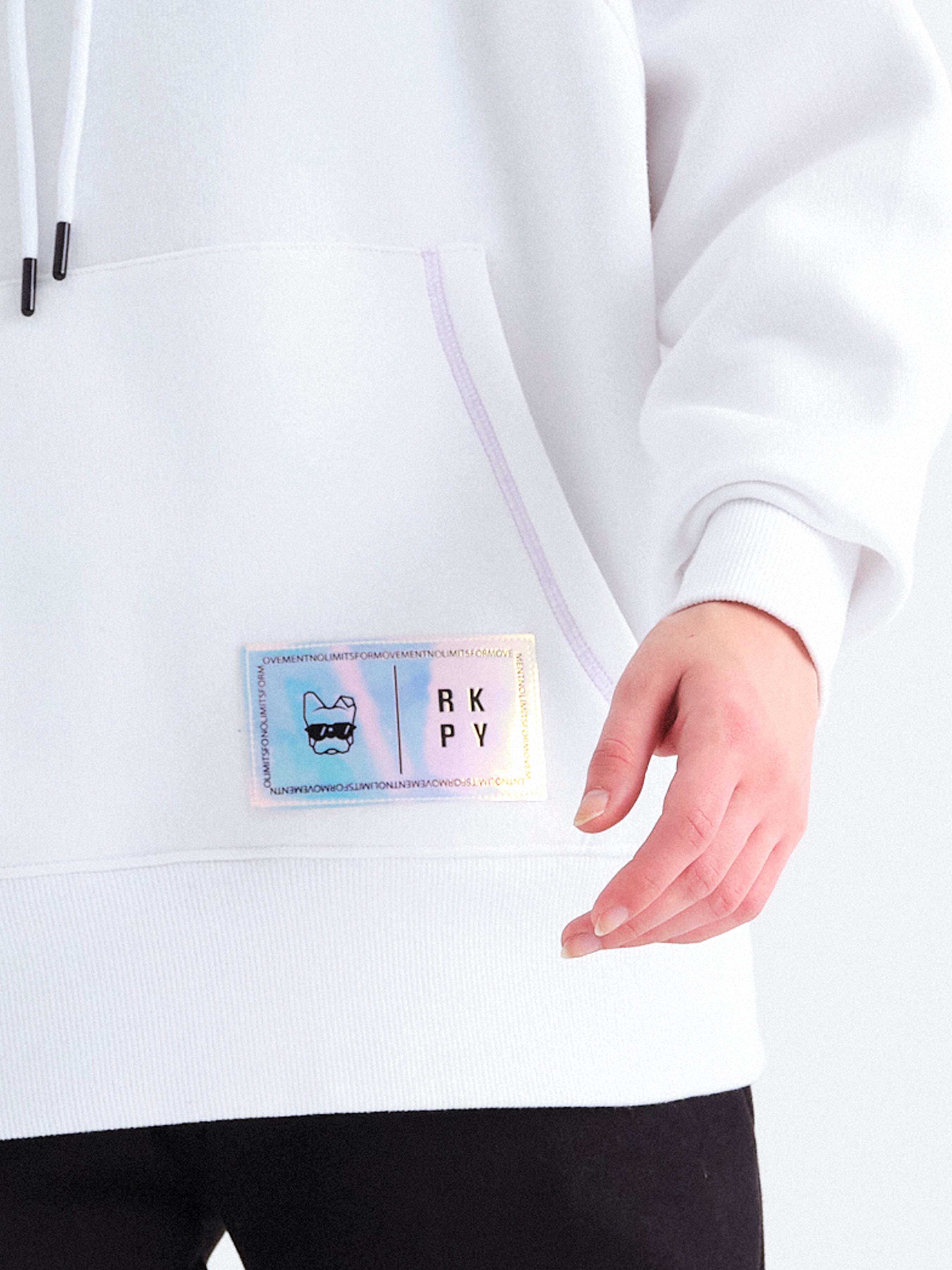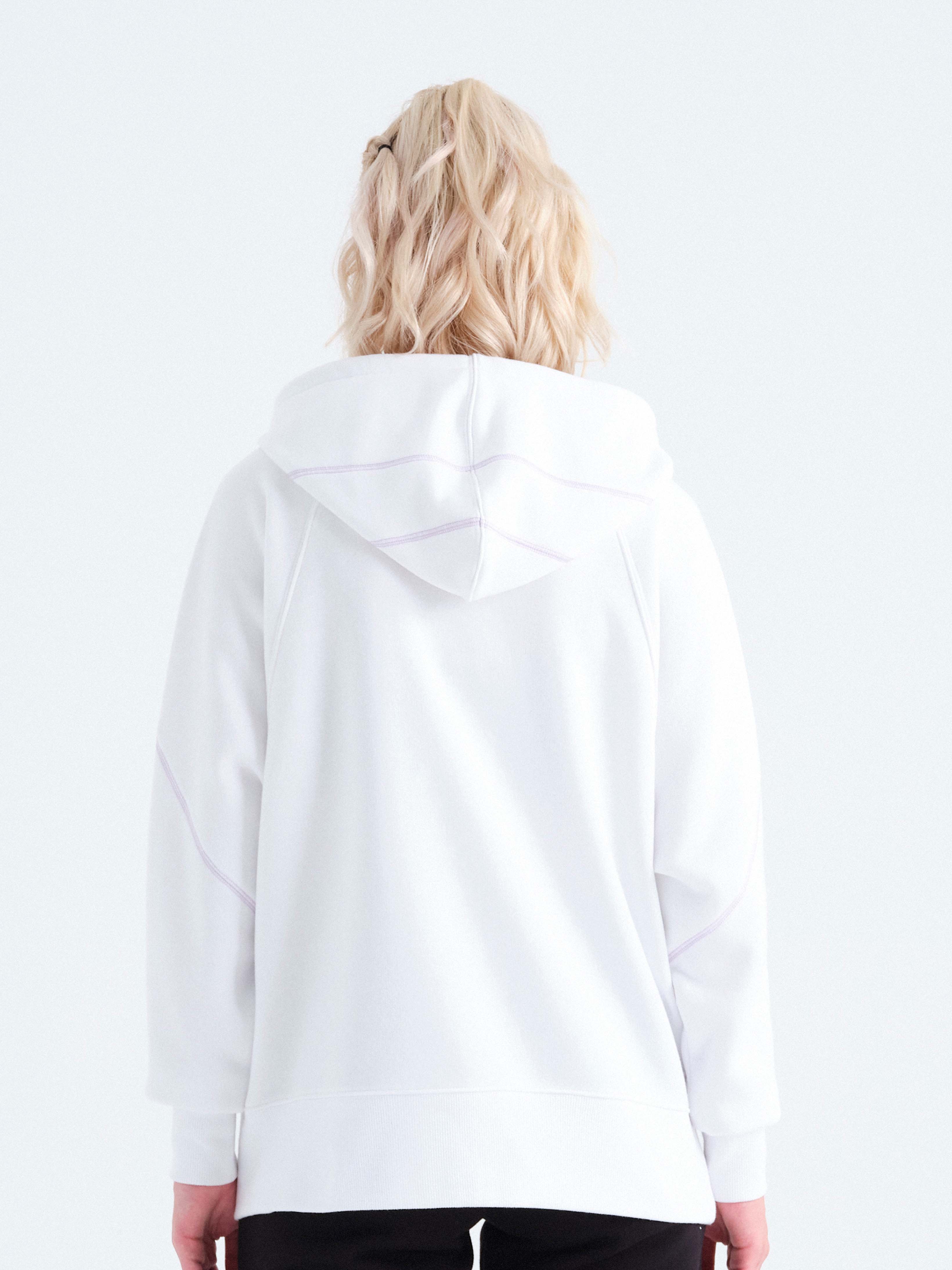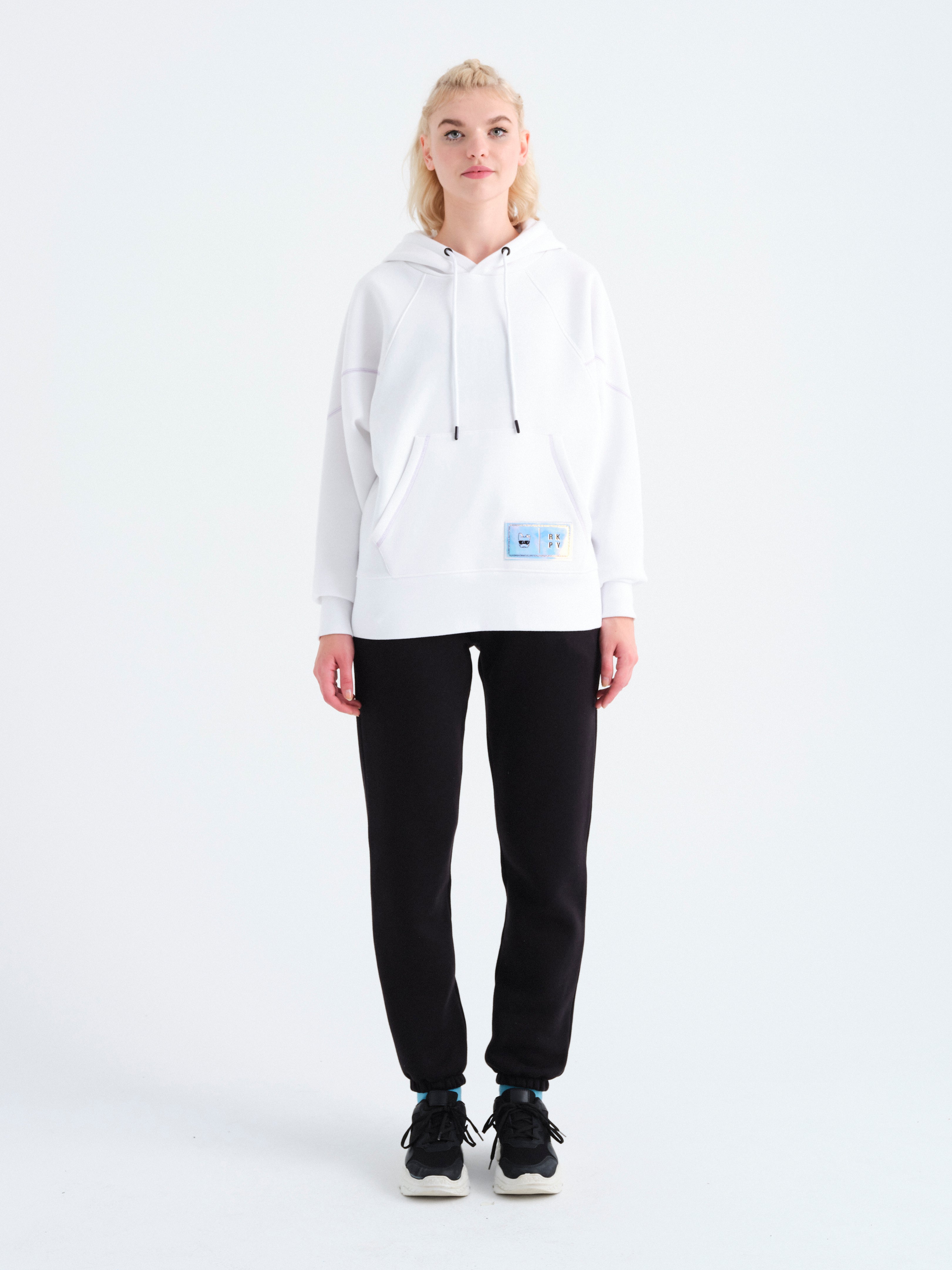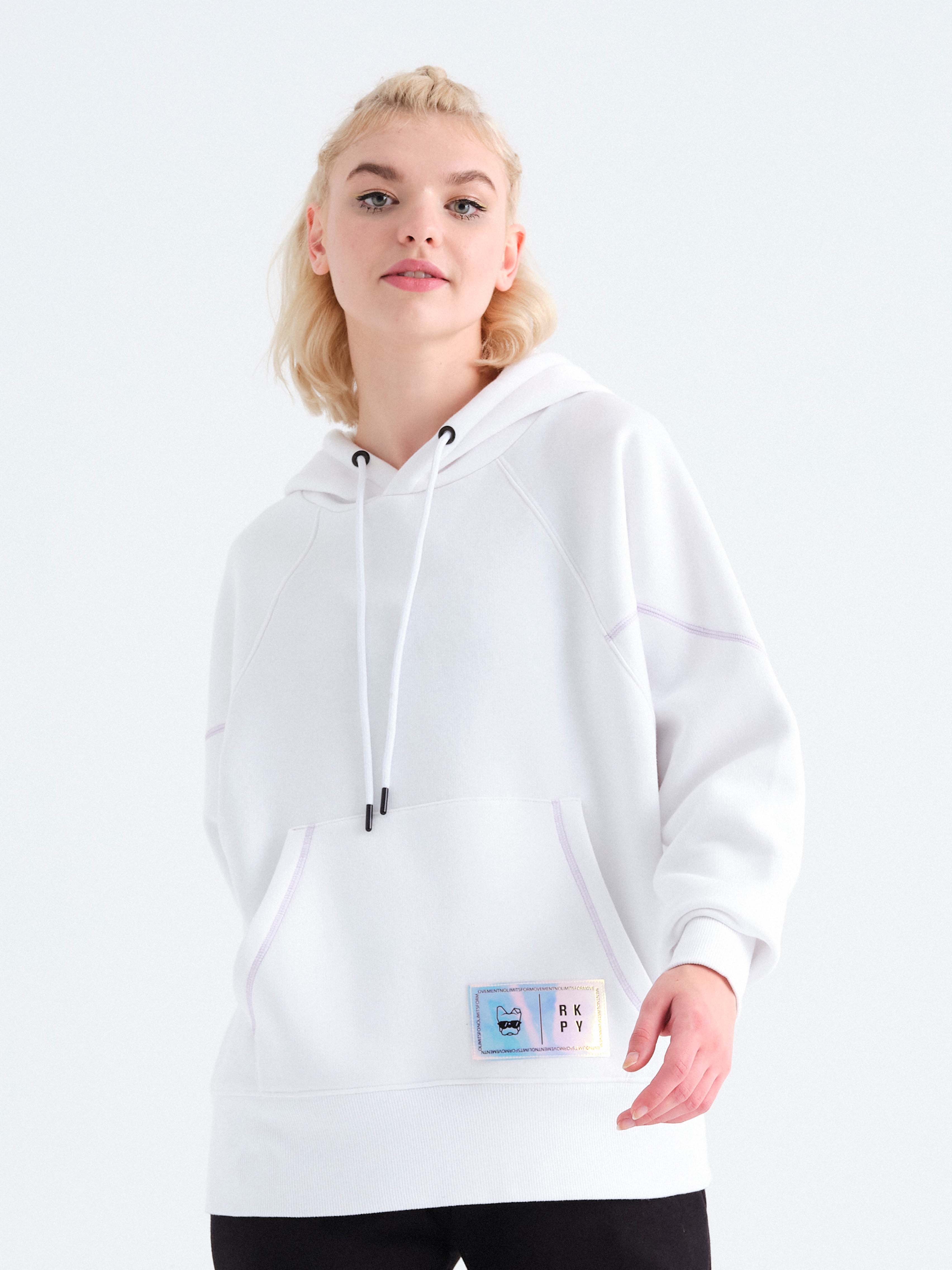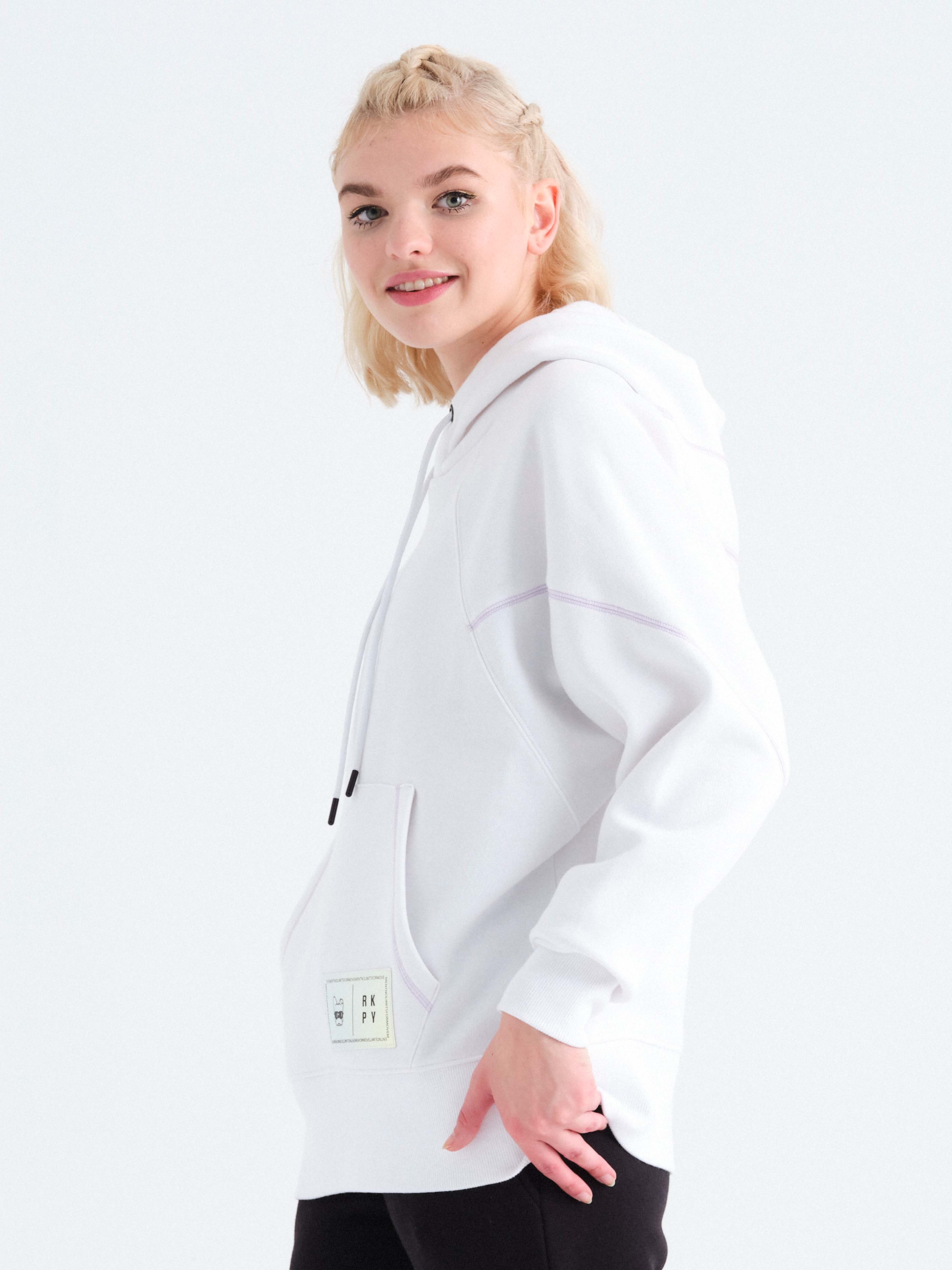 - Organik Kadın uzun kollu beyaz sweatshirt, kanguru cepli, kapüşonu büzgü ipli, boyun arkasında balıksırtı şeritli, reglan dikişli, cebin sol tarafında özel tasarım parlak etiketli ve üst kollarda, kapüşon ve ceplerde kontrast dikişler mevcuttur. Manşetleri ve etek ucu elastik ribanalıdır.