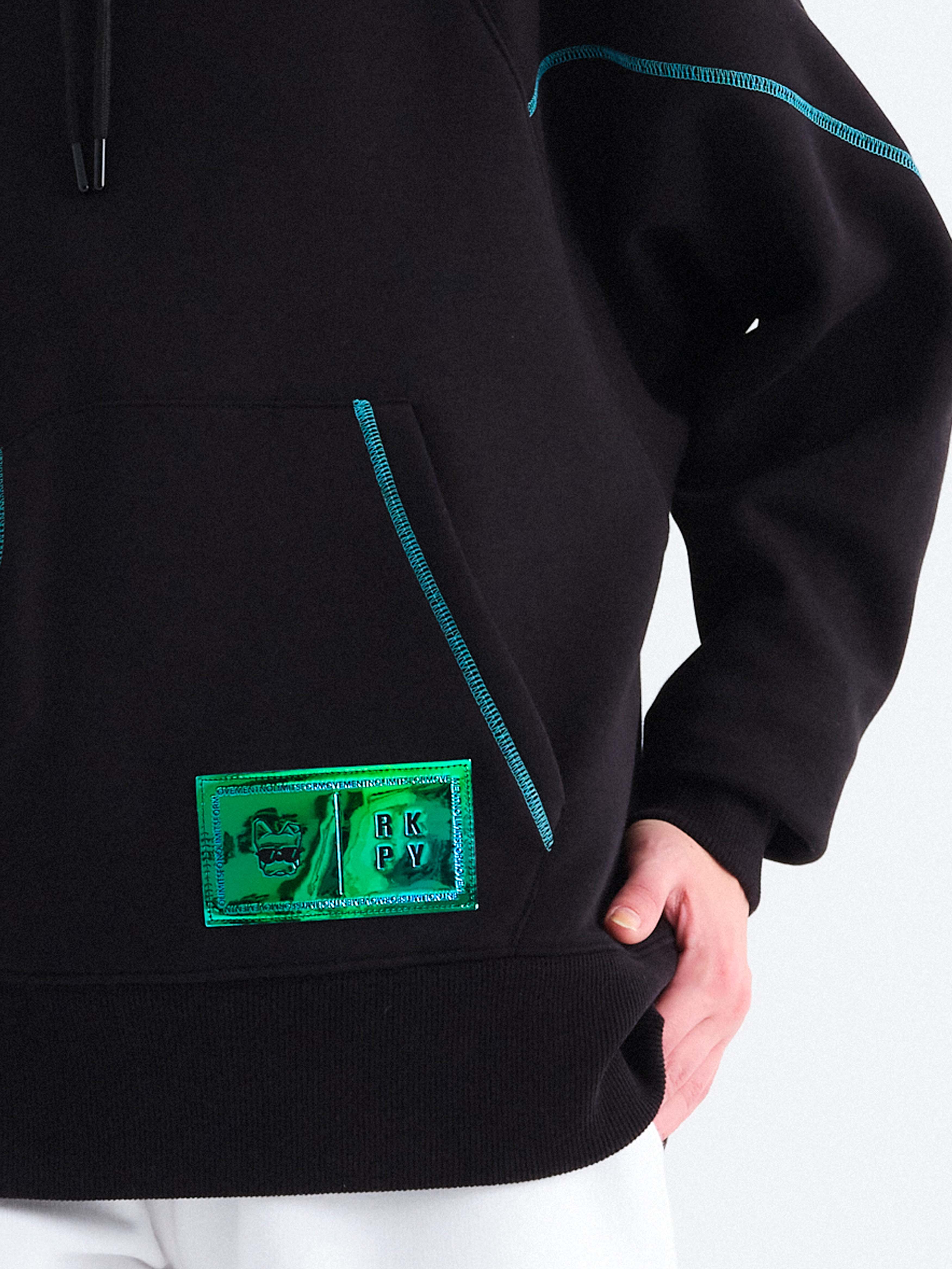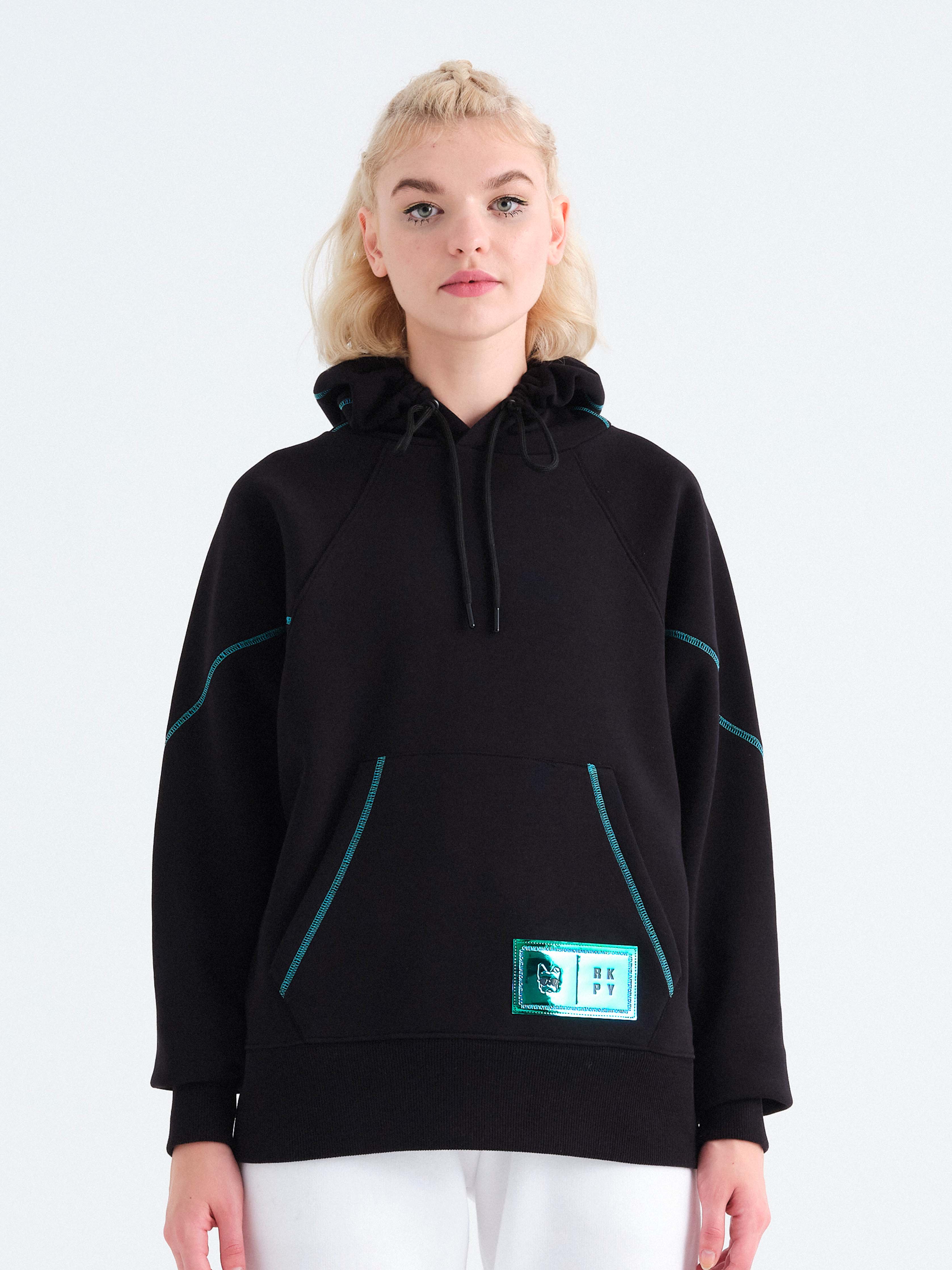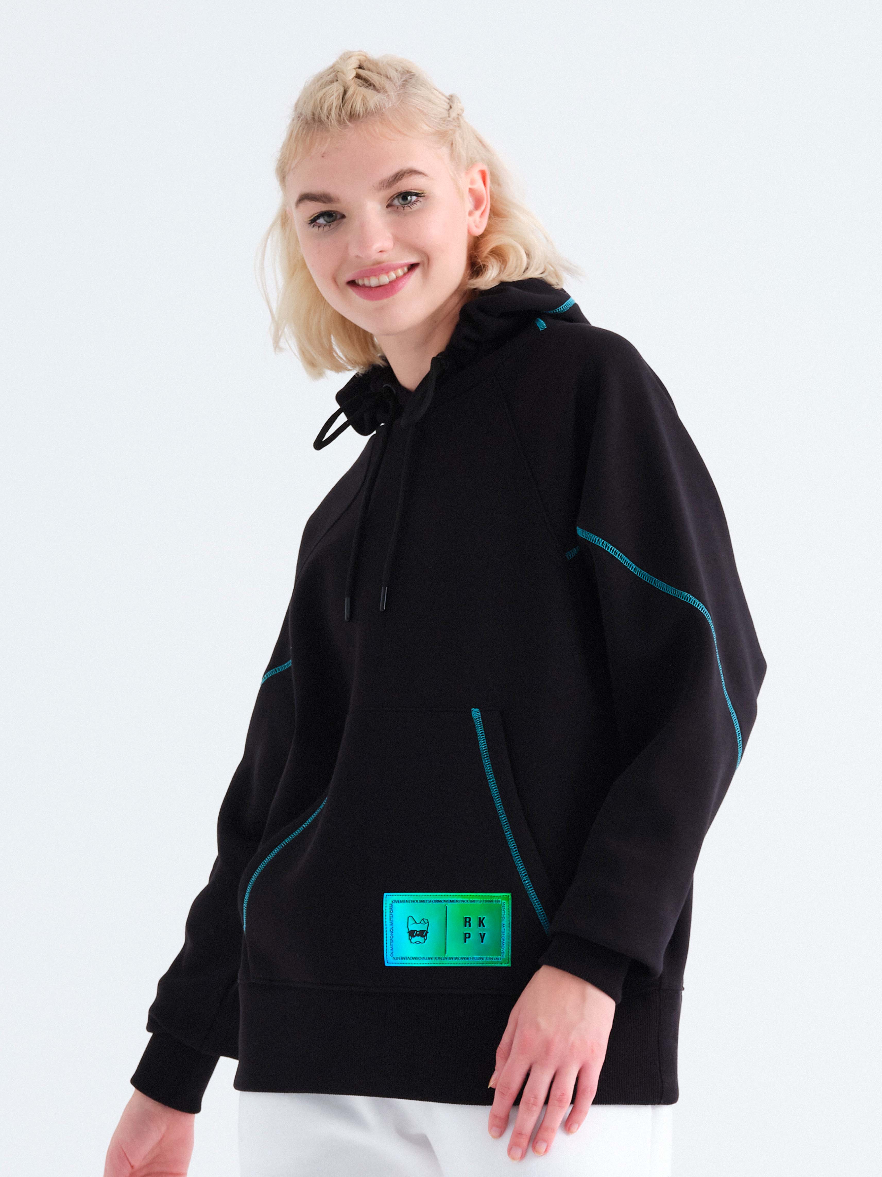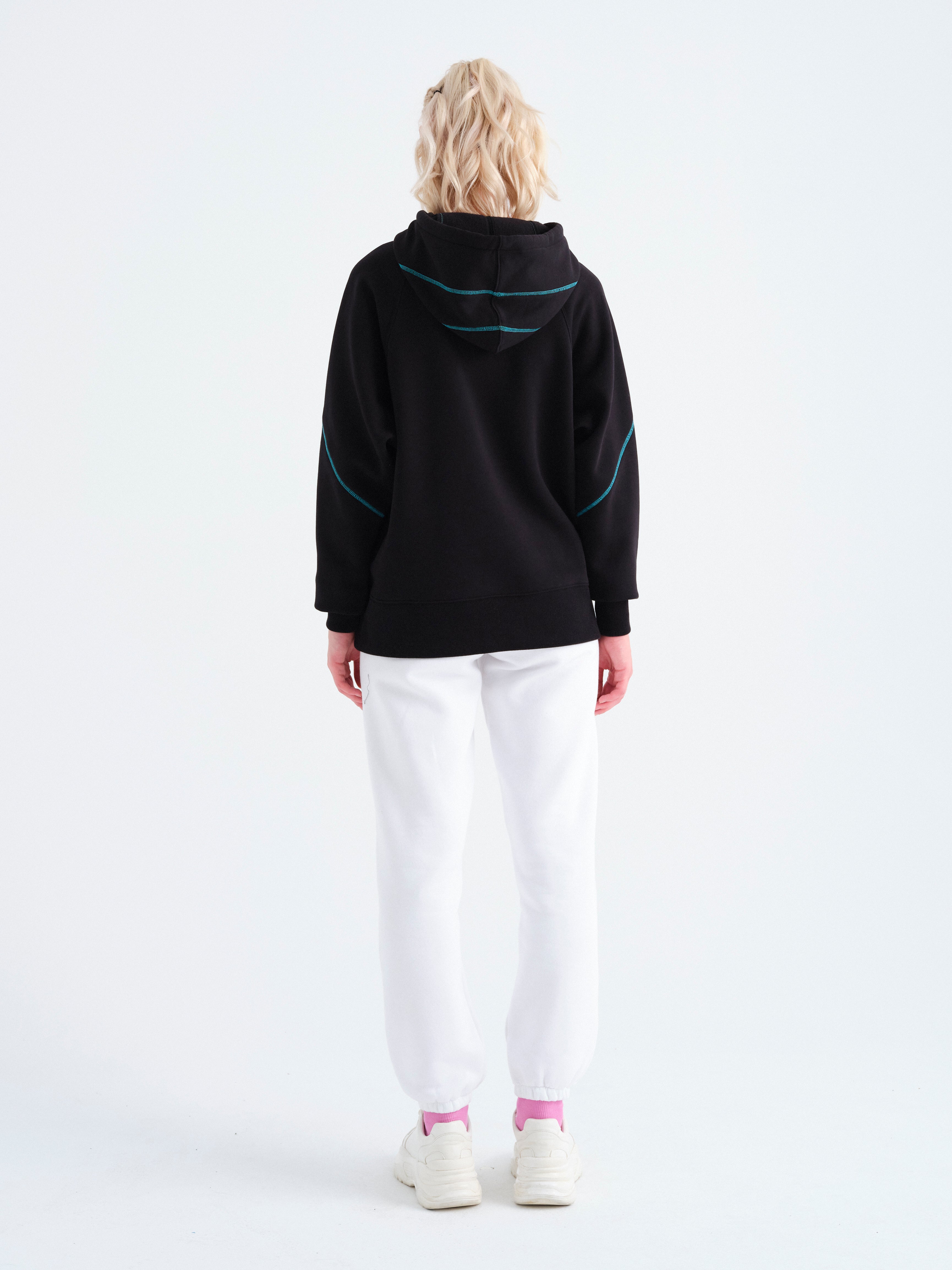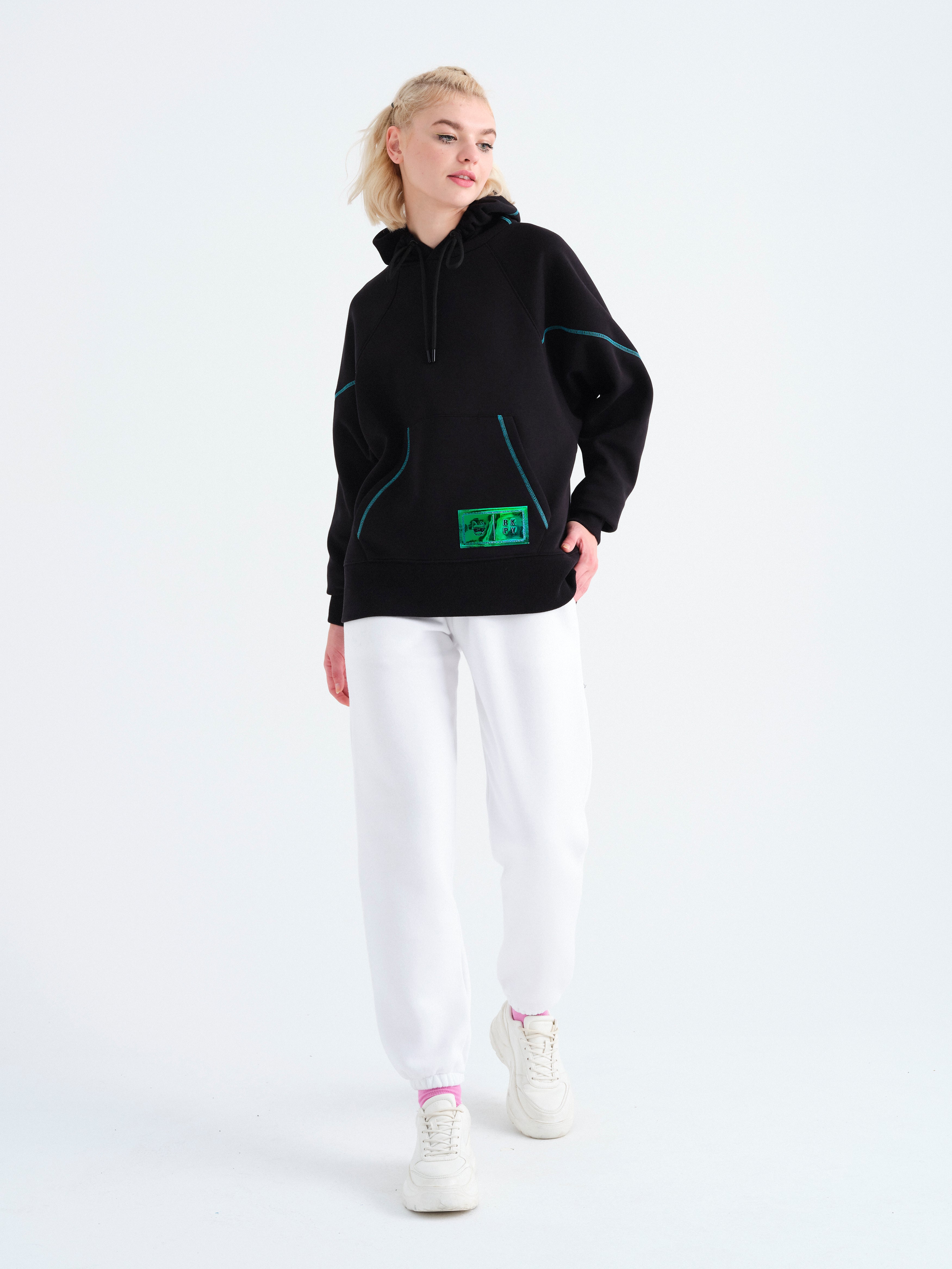 - Organik Kadın uzun kollu beyaz sweatshirt, kanguru cepli, kapüşonu büzgü ipli, boyun arkasında balıksırtı şeritli, reglan dikişli, cebin sol tarafında özel tasarım parlak etiketli ve üst kollarda, kapüşon ve ceplerde kontrast dikişler mevcuttur. Manşetleri ve etek ucu elastik ribanalıdır.