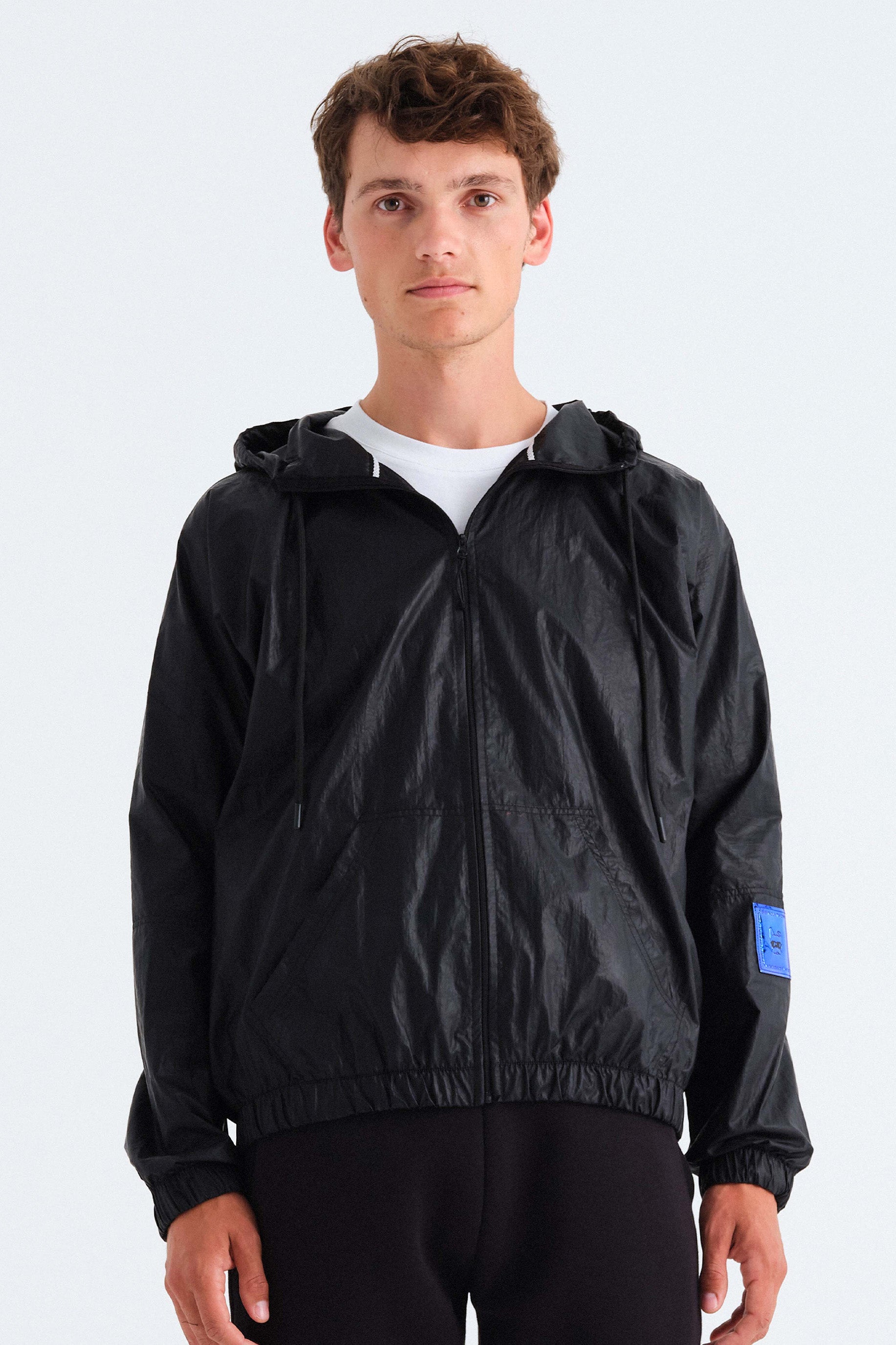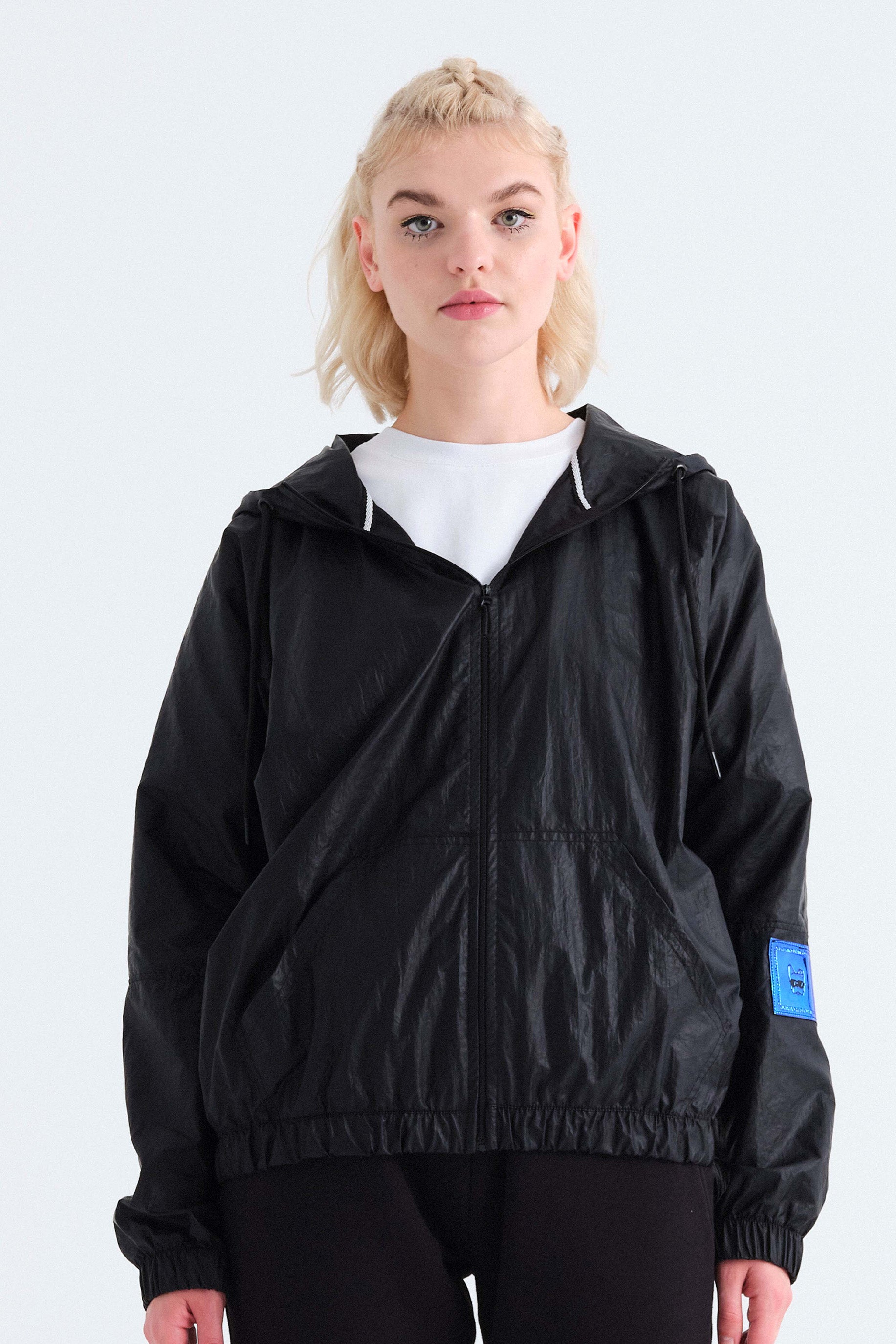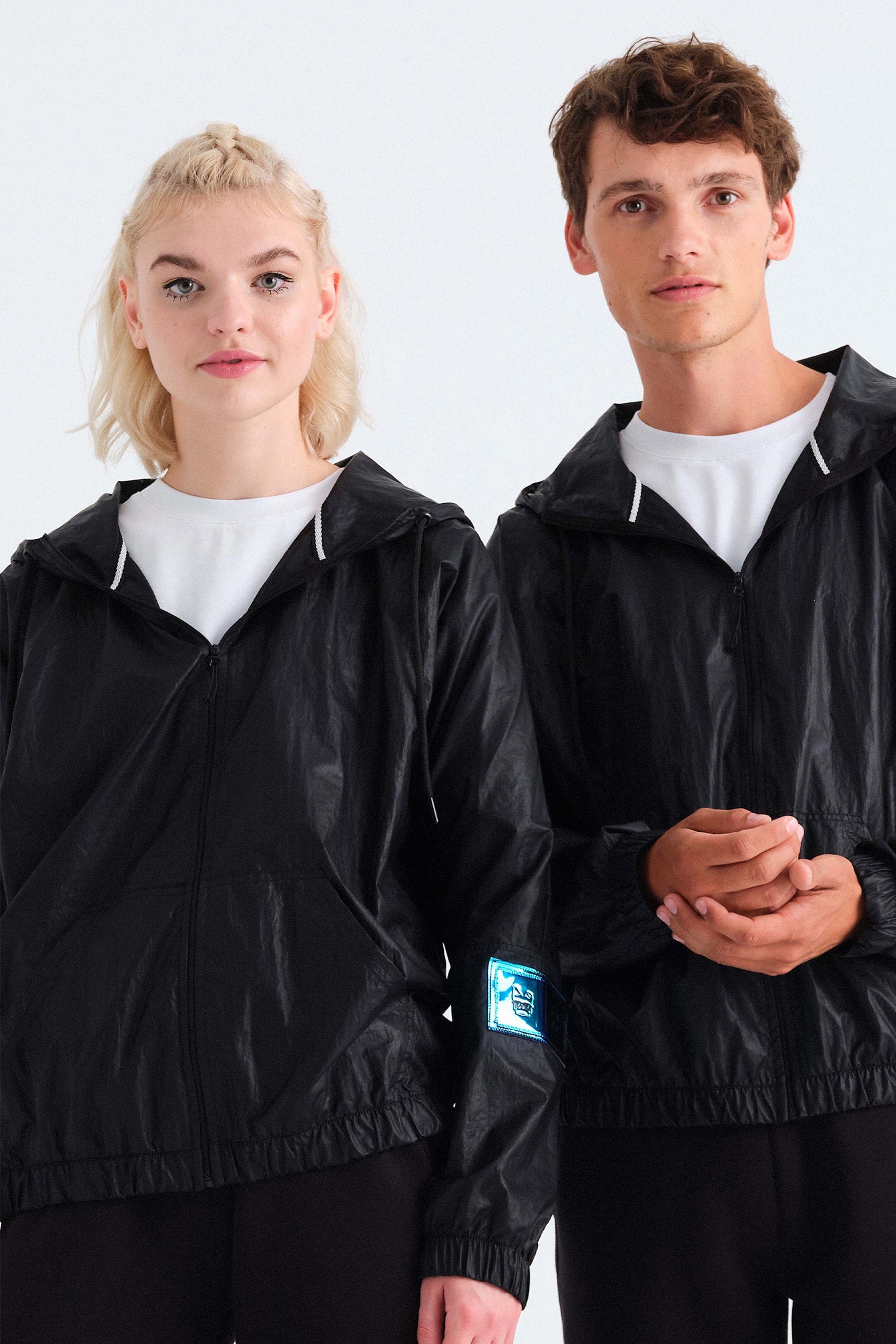 Yüksek yakalı kapüşonlu ve kontrast siyah büzgü ipli, ön tarafında tam boy fermuarlı, siyah renginde ve suya dayanıklı unisex bomber ceket. Etek ucunda ve manşetlerinde elastik şeritler. Sol kolda özel tasarım etiketi.