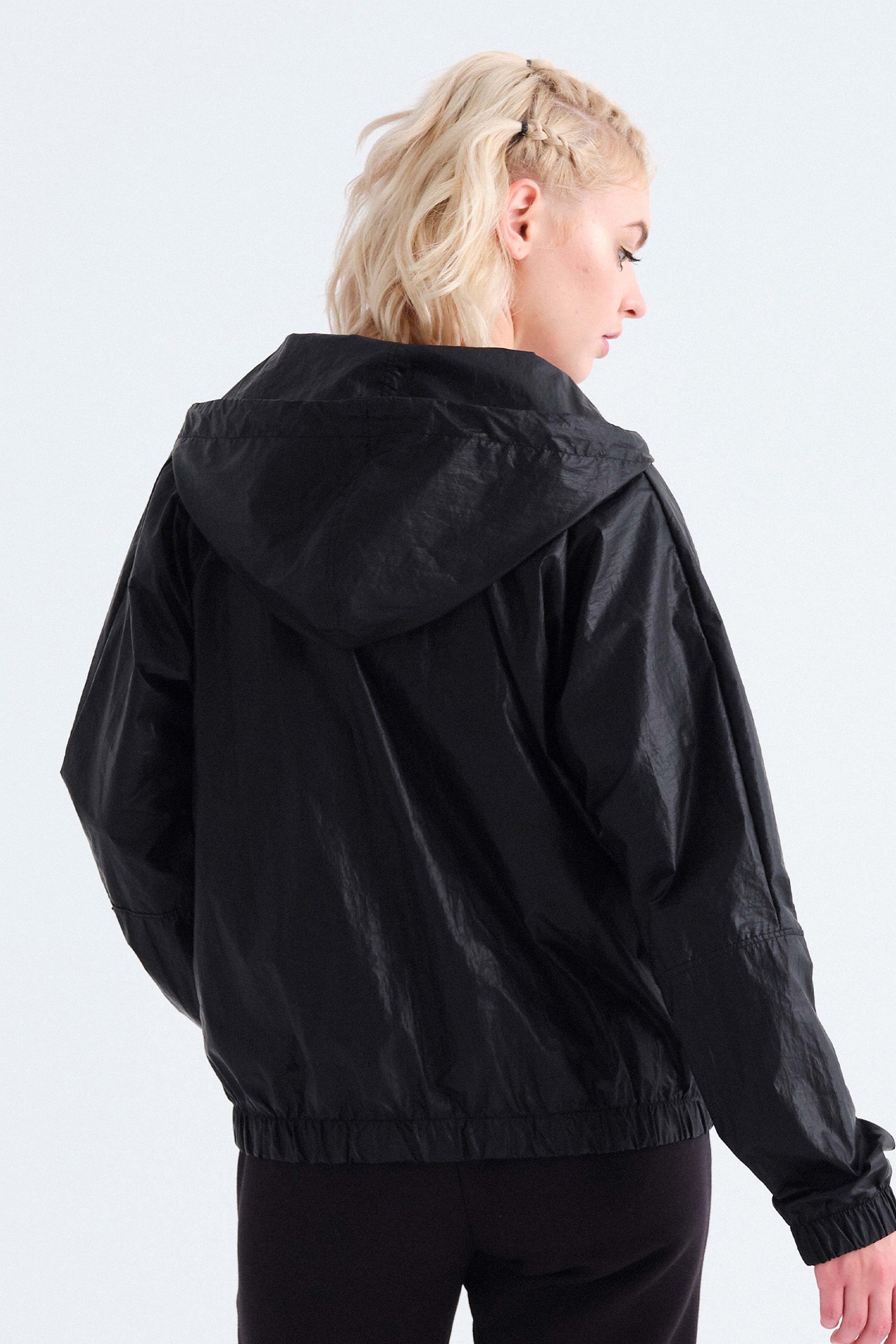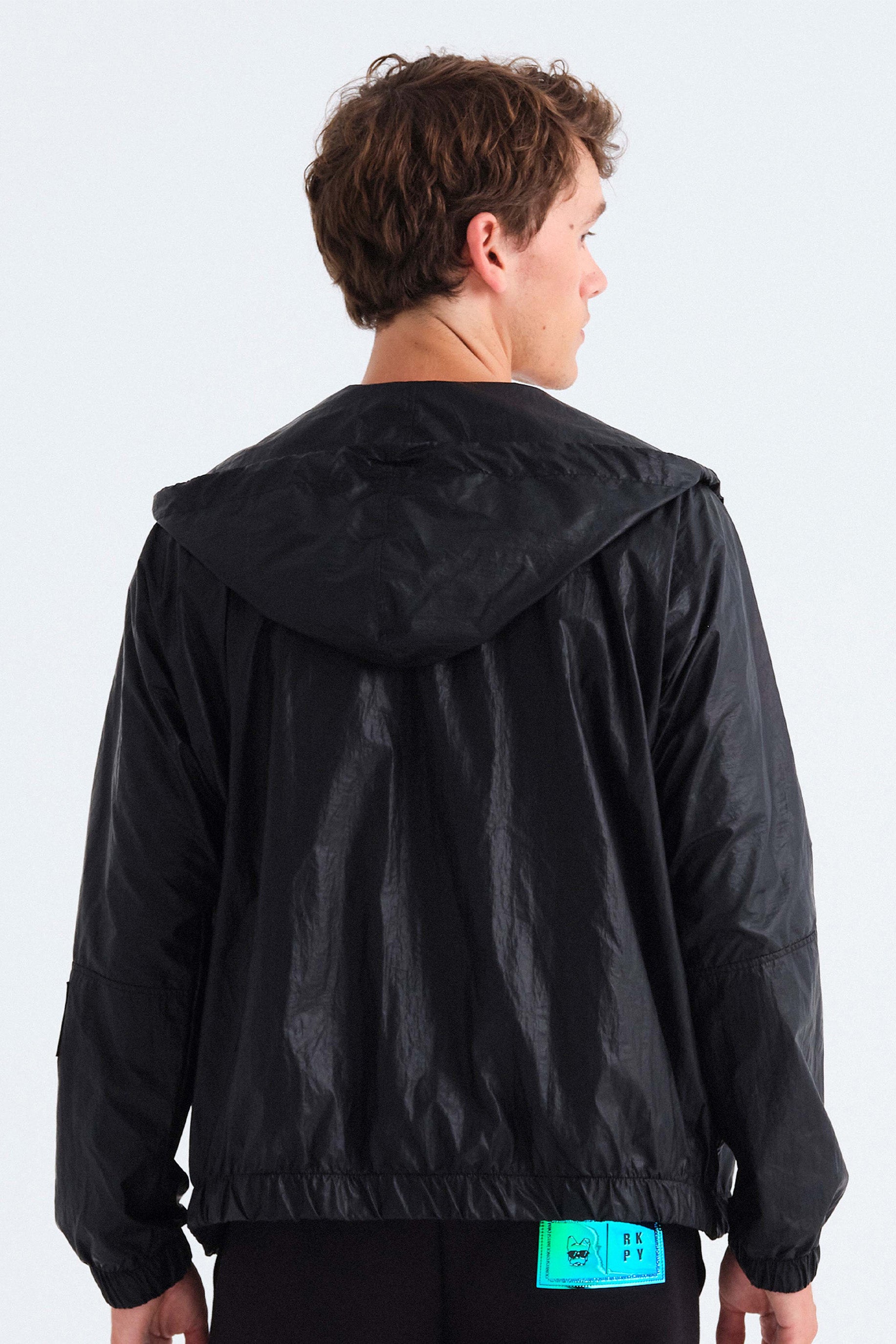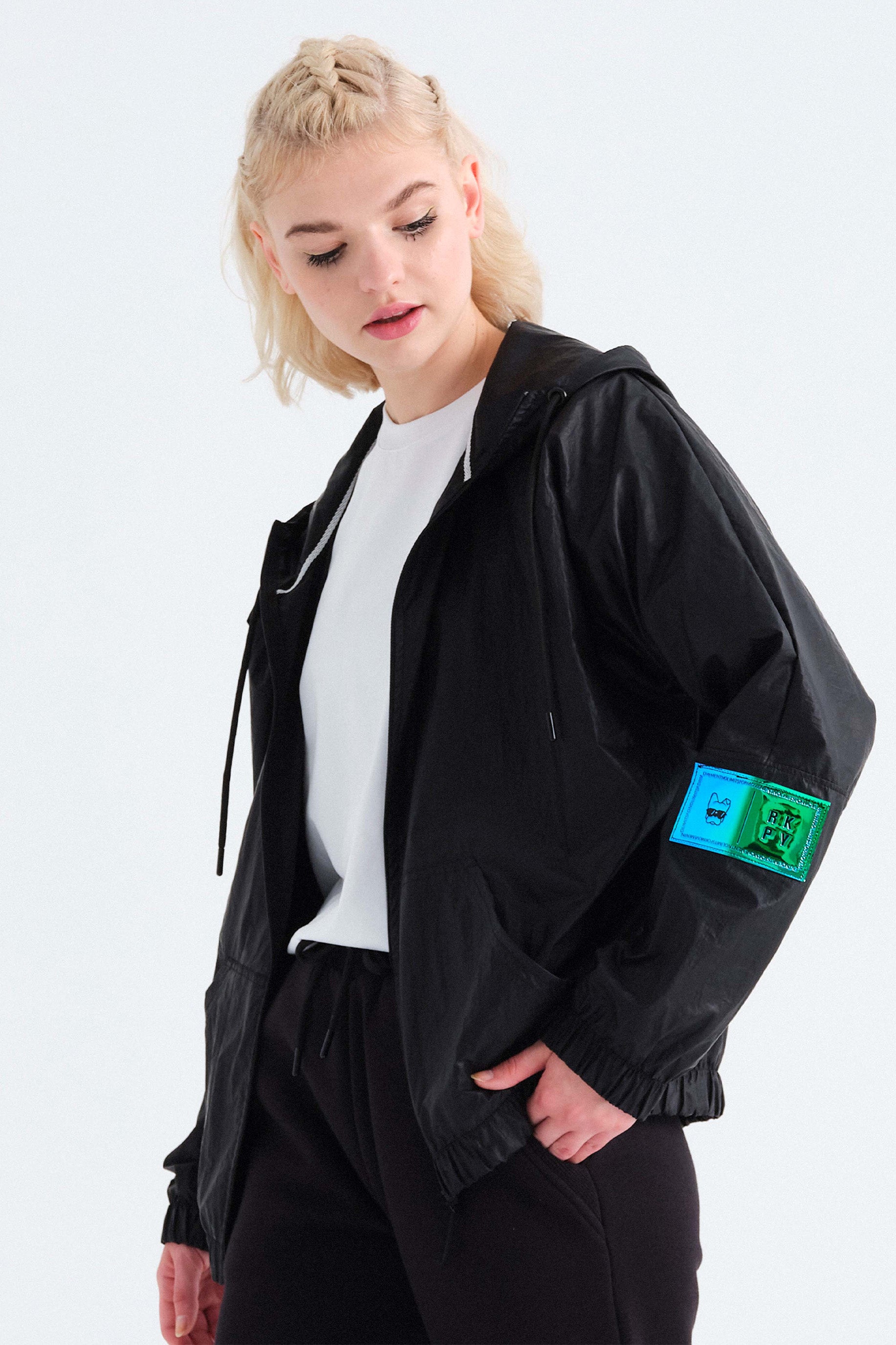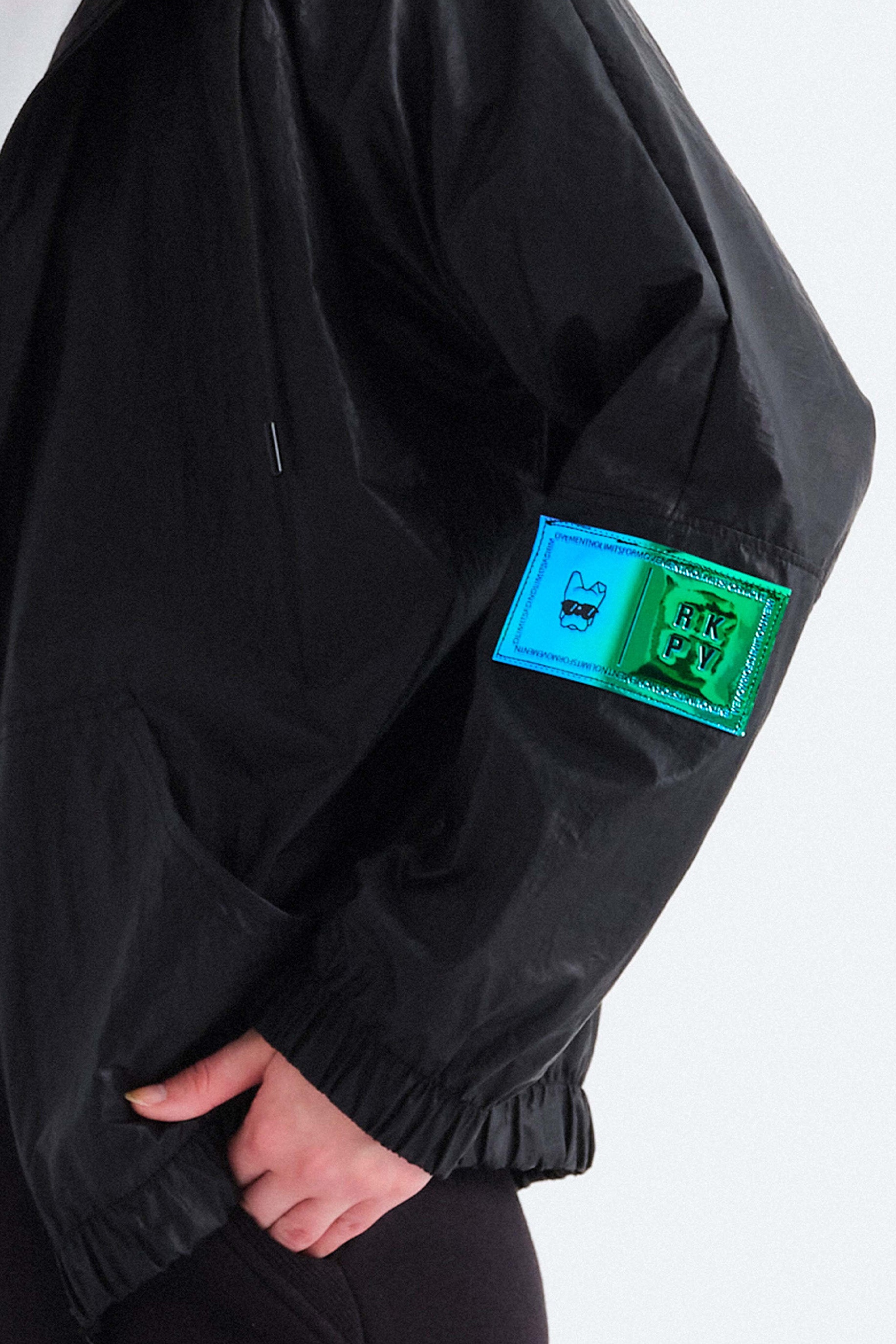 Yüksek yakalı kapüşonlu ve kontrast siyah büzgü ipli, ön tarafında tam boy fermuarlı, siyah renginde ve suya dayanıklı unisex bomber ceket. Etek ucunda ve manşetlerinde elastik şeritler. Sol kolda özel tasarım etiketi.