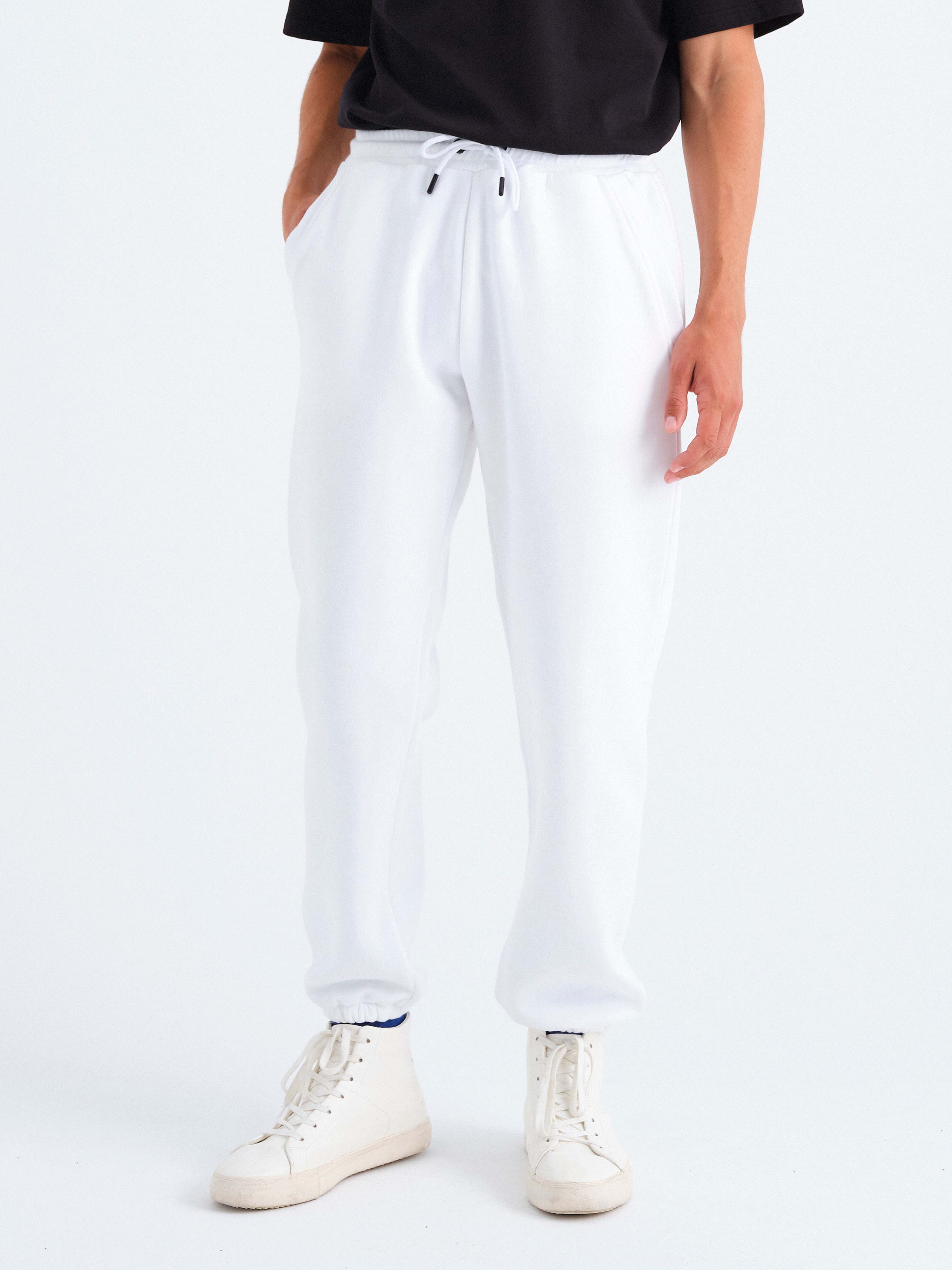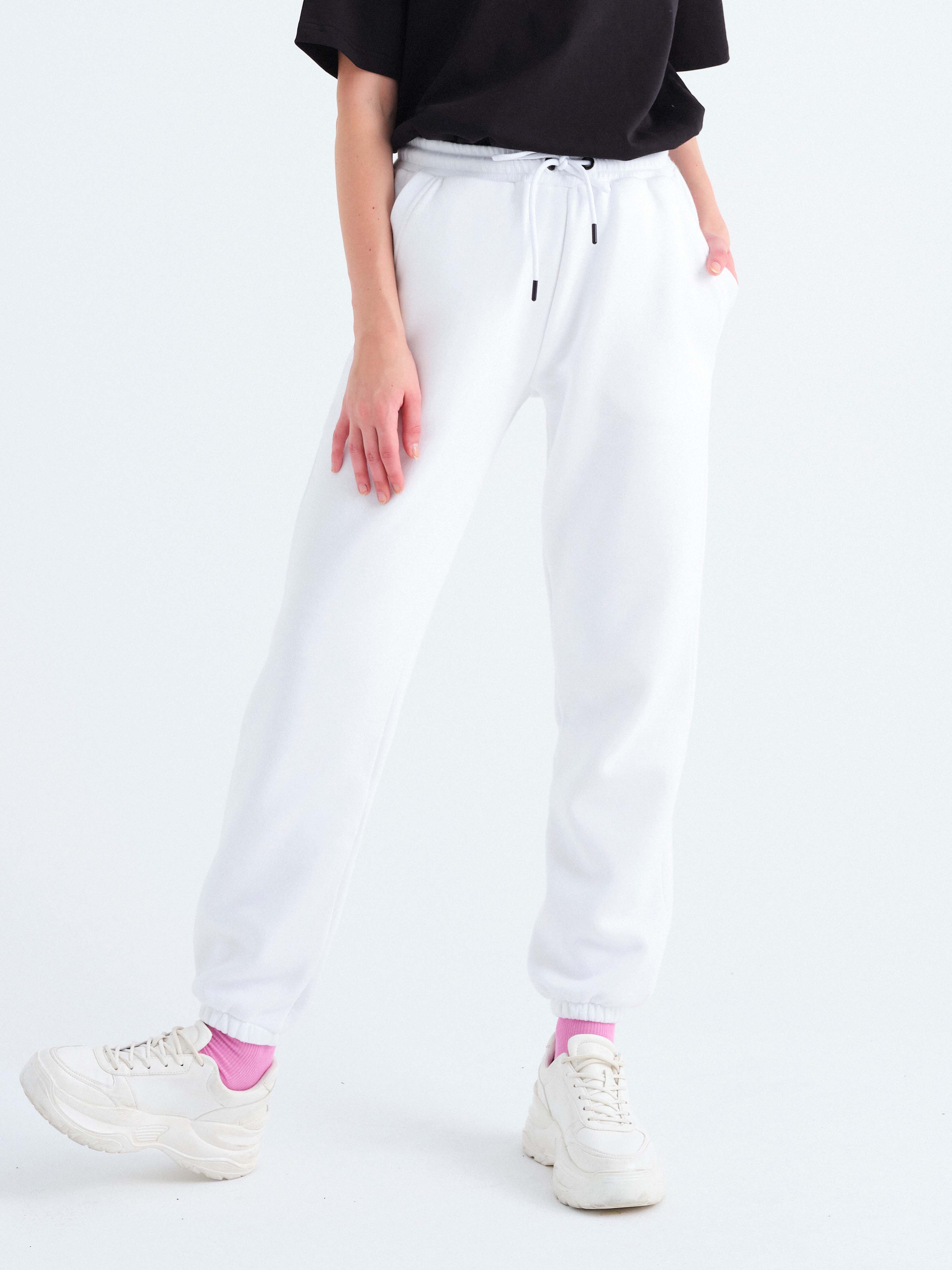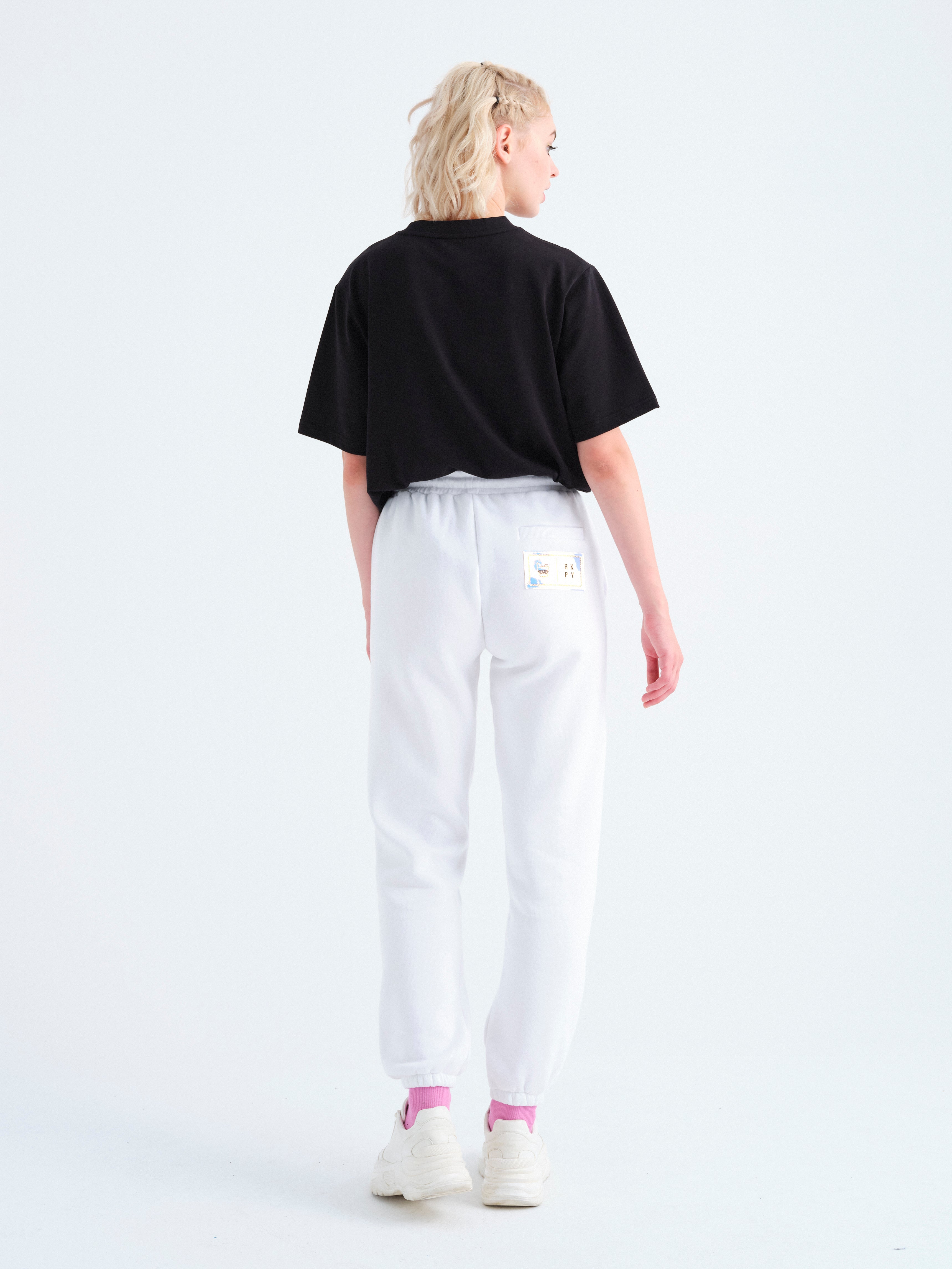 - Yan cepli, beli büzgü ipli, sağ yanda arka cepli ve arka cepte özel tasarım parlak etiketli, beli elastik ribanalı, eşofman altının etek ucuna elastik bant takılı, unisex organik pamuklu geri dönüştürülmüş polyester beyaz eşofman altı.