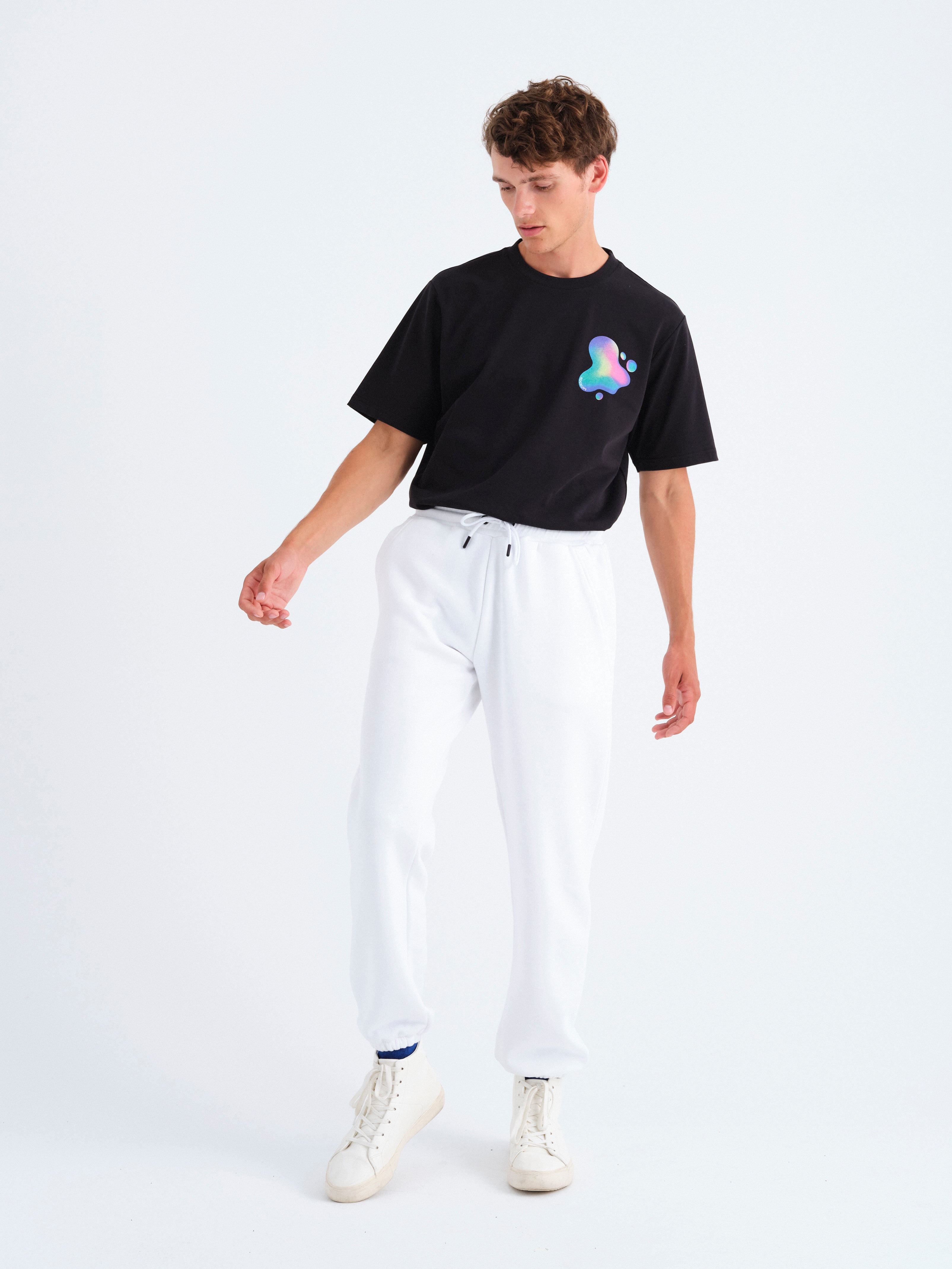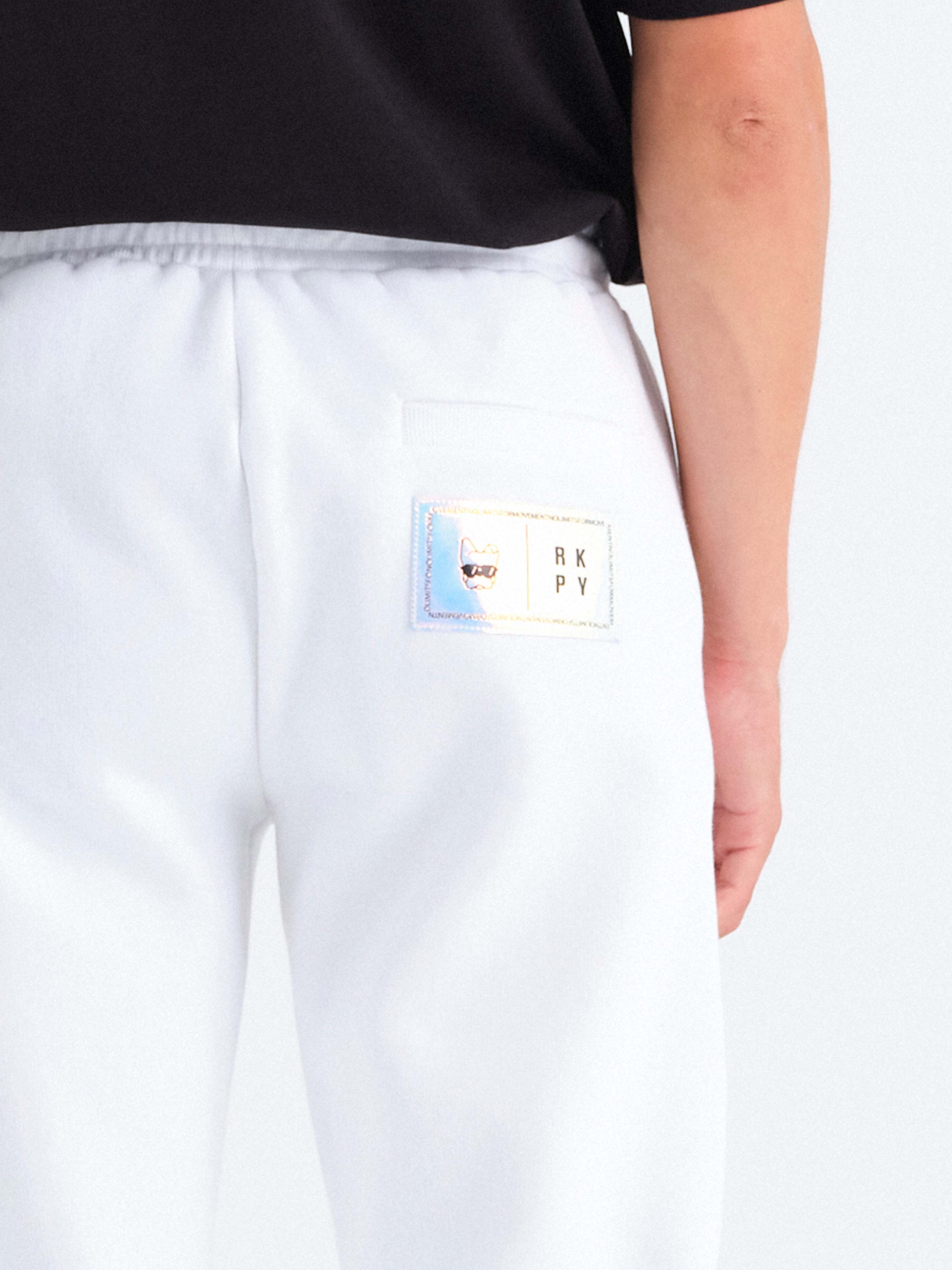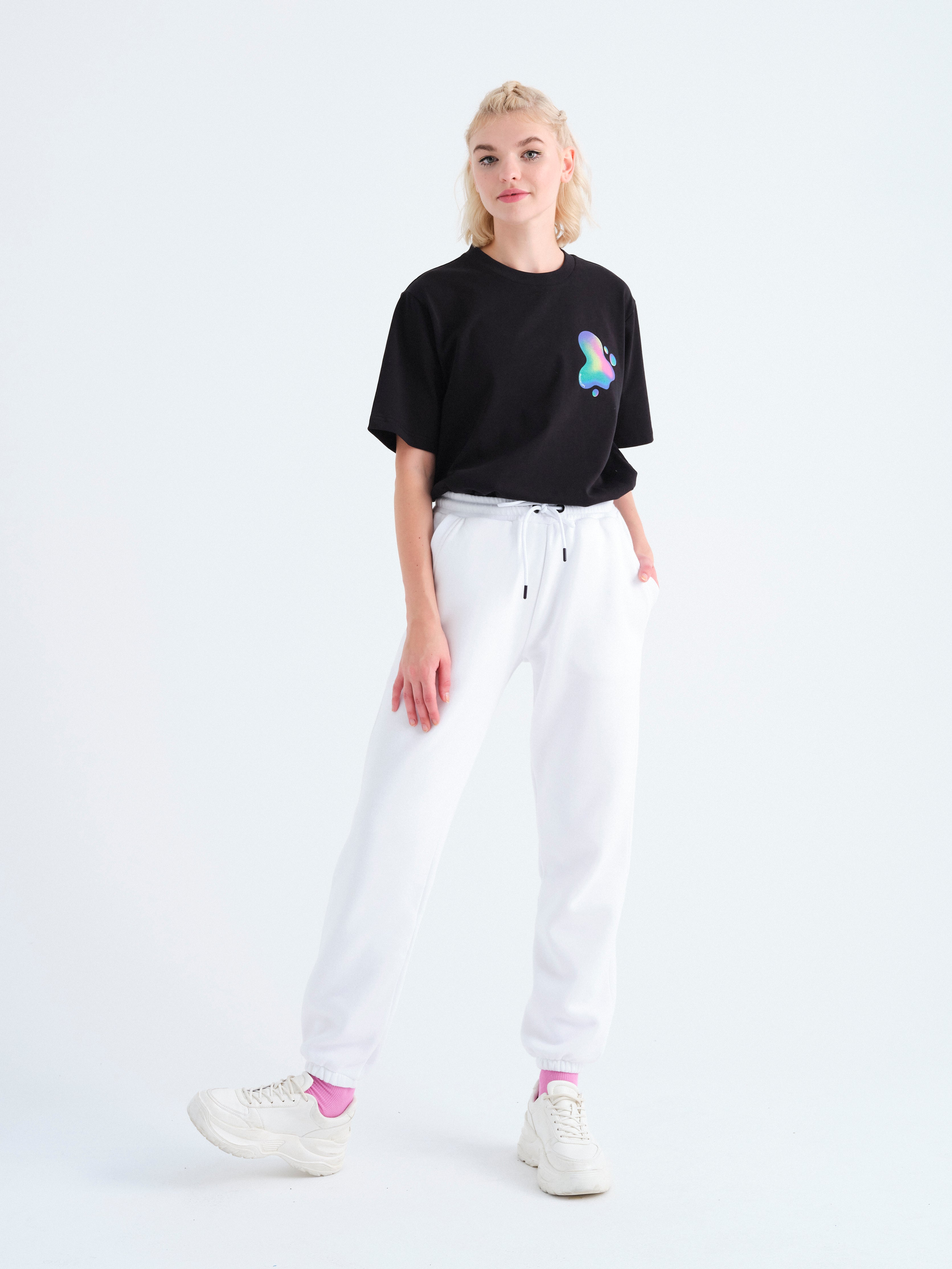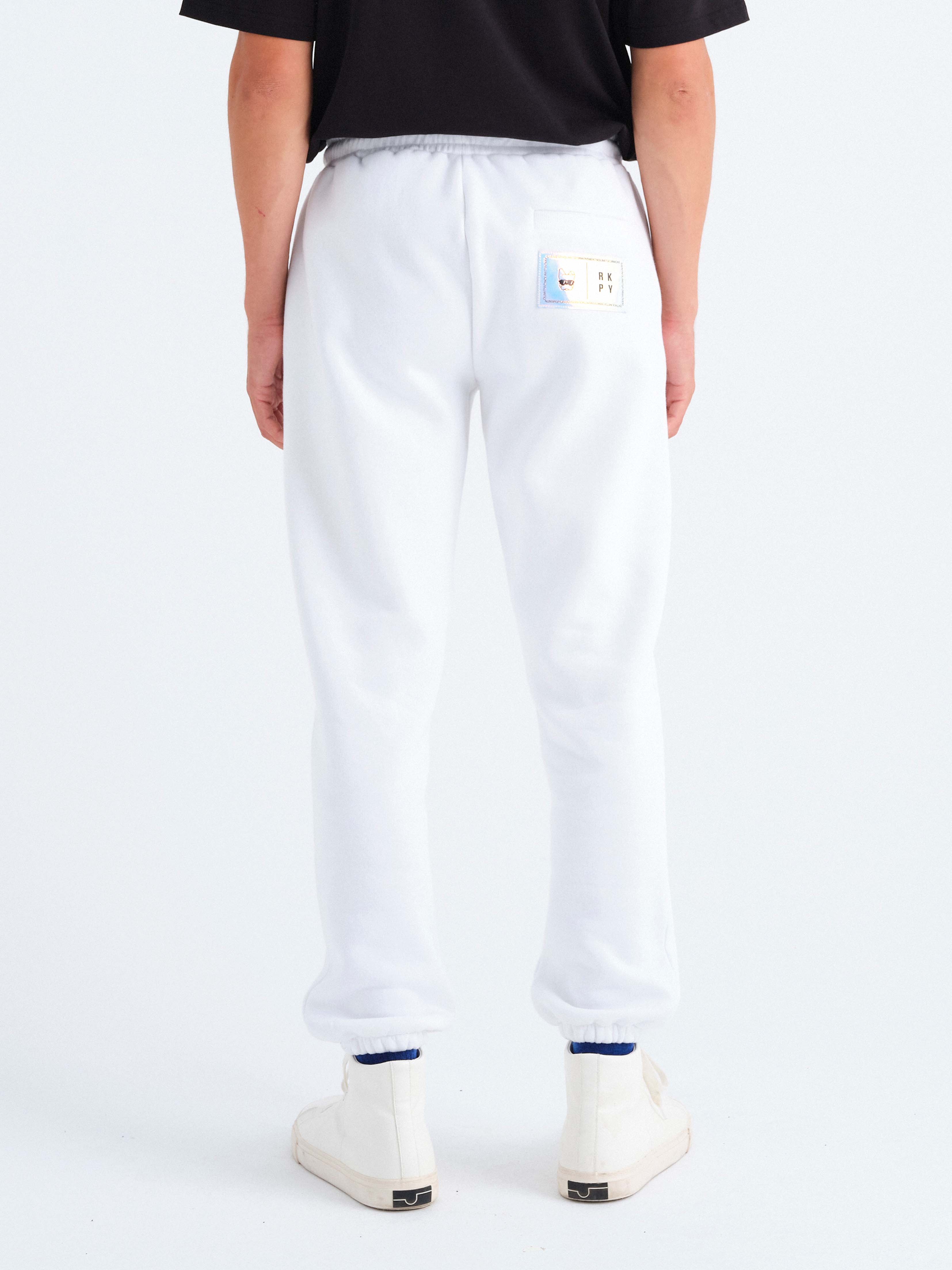 - Yan cepli, beli büzgü ipli, sağ yanda arka cepli ve arka cepte özel tasarım parlak etiketli, beli elastik ribanalı, eşofman altının etek ucuna elastik bant takılı, unisex organik pamuklu geri dönüştürülmüş polyester beyaz eşofman altı.