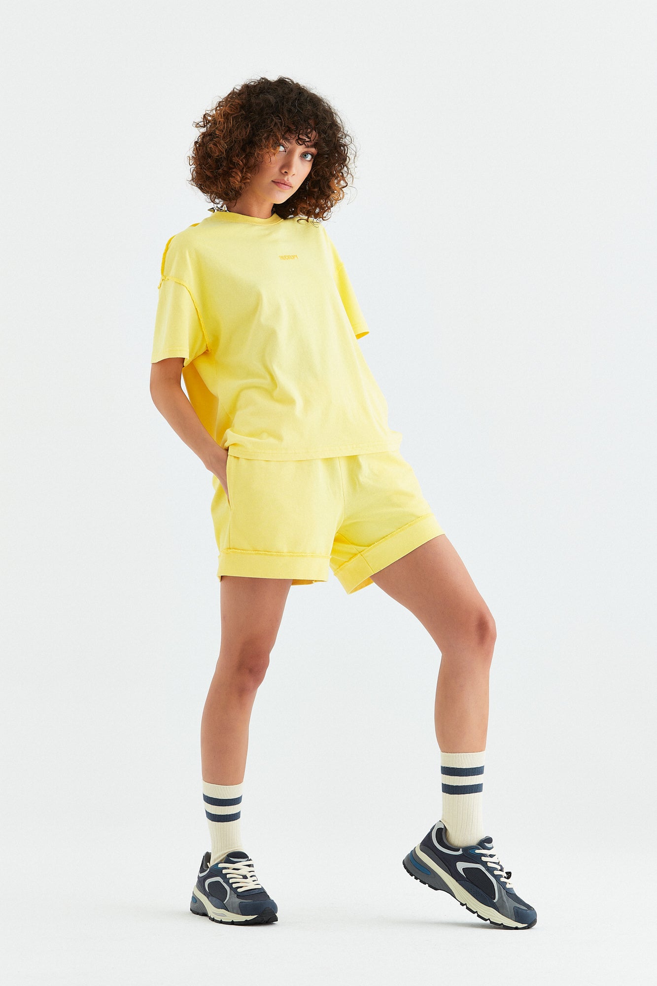- Sarı renk opsiyonunda, giysinin ön tarafında boyun dikişinin 6 cm altına yerleştirilmiş orijinal "Rockupy" logosu işlemeli, %100 pamuklu bisiklet yaka, rahat ve şık kadın tişörtü. Giysilere parça boya ve özel yıkama tekniği uygulanmıştır. Kumaş pis dikiş tekniği ile dikilmiştir.
