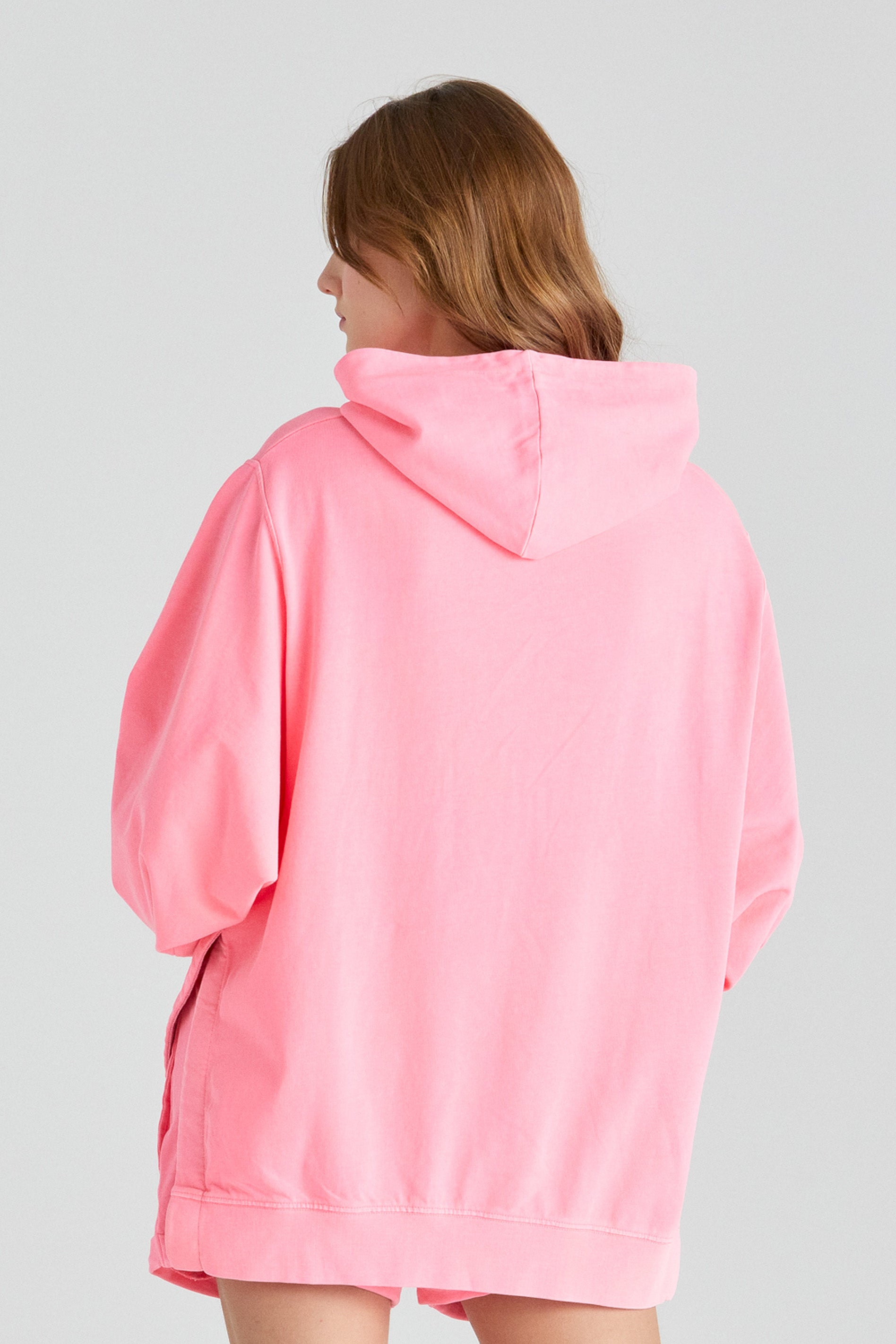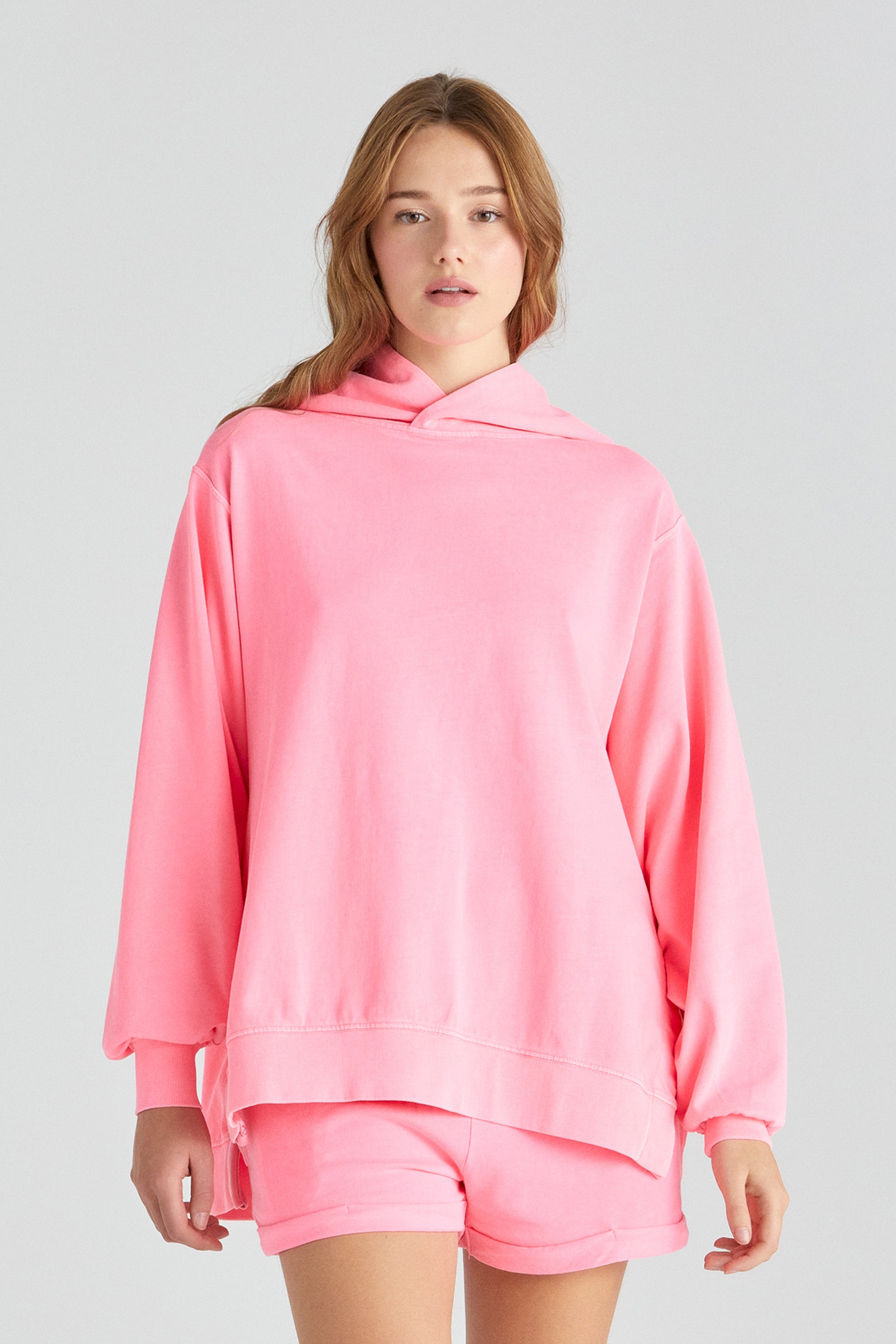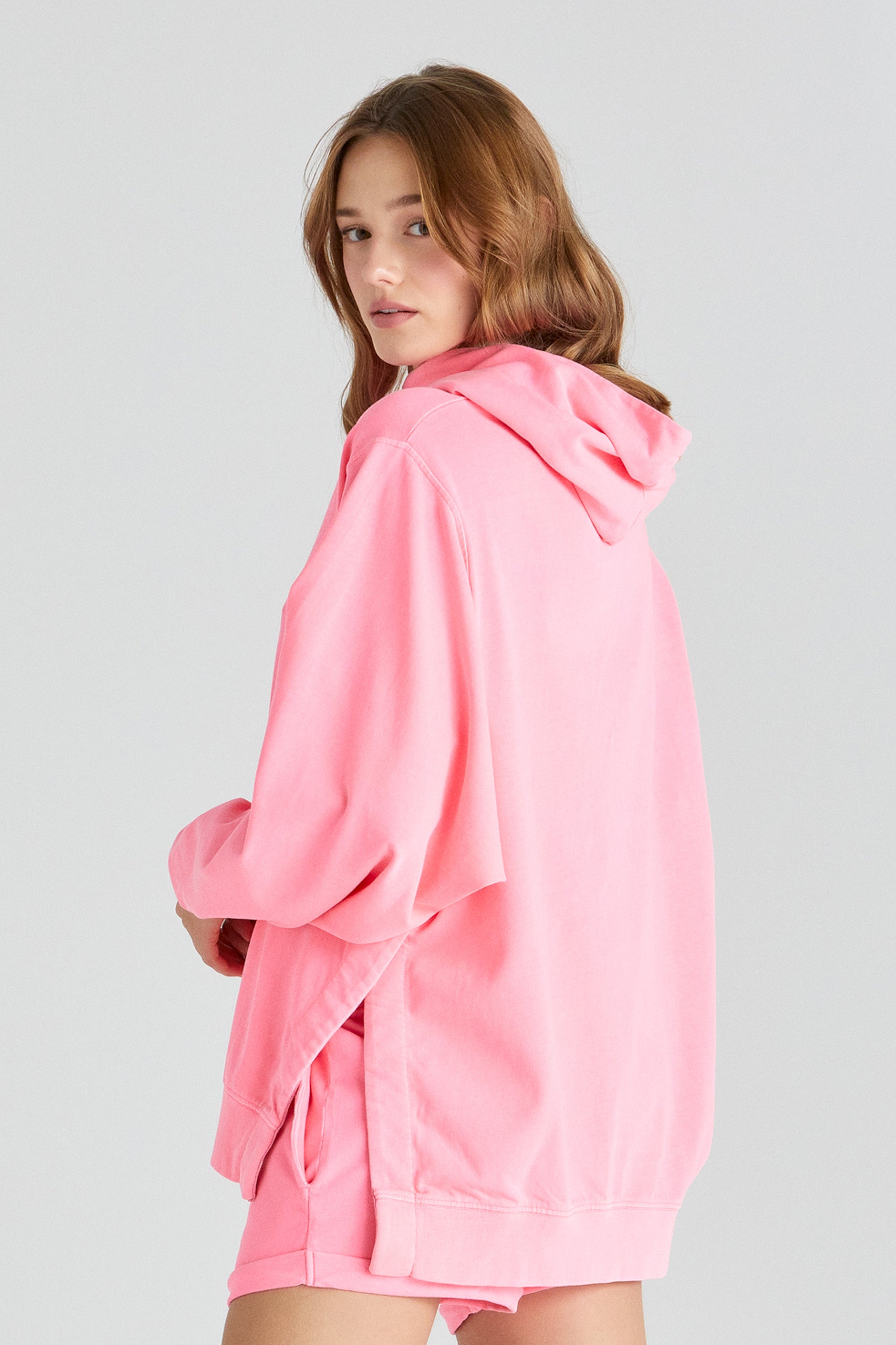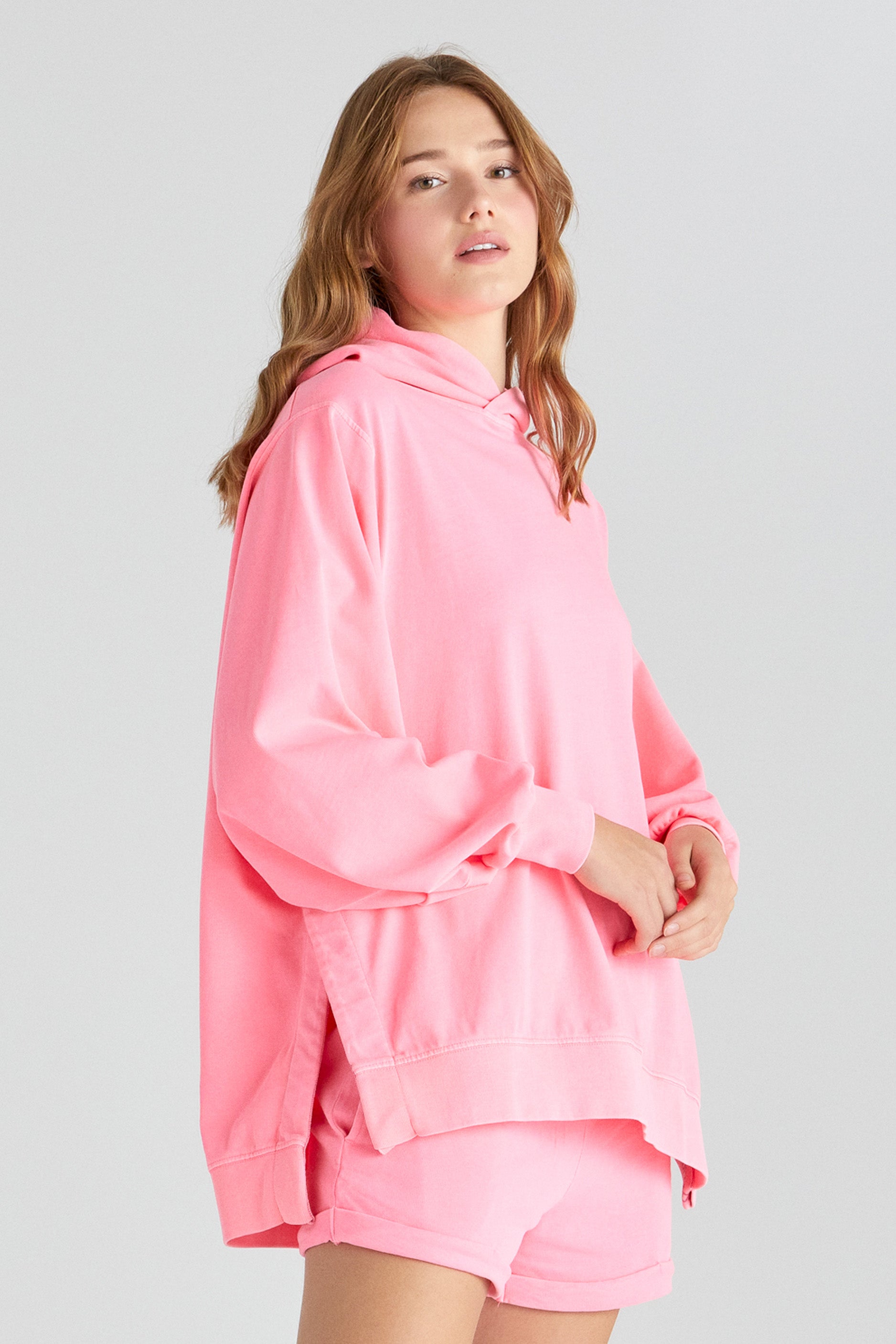 Her iki tarafında yırtmaçlı ve yırtmaçların iç kenarlarında Orijinal “Rockupy” logolu örgü şeritli, neon pembesi renk grubunda, rahat ve şık %100 pamuk kollu kadın kapüşonlu sweatshirt. Bu kapüşonlu hoş bir şekilde yumuşak ve yüksek bir kaliteye sahiptir.