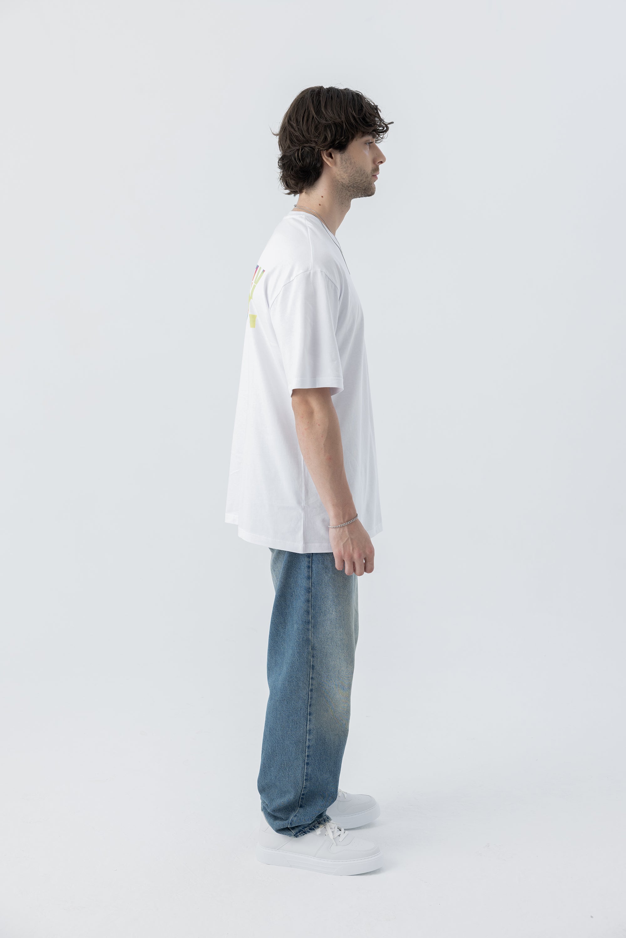 Yumuşak tuşeli pamuklu kumaştan üretilen unisex bisiklet yaka tişört, oversize kalıptır ve yakası r...