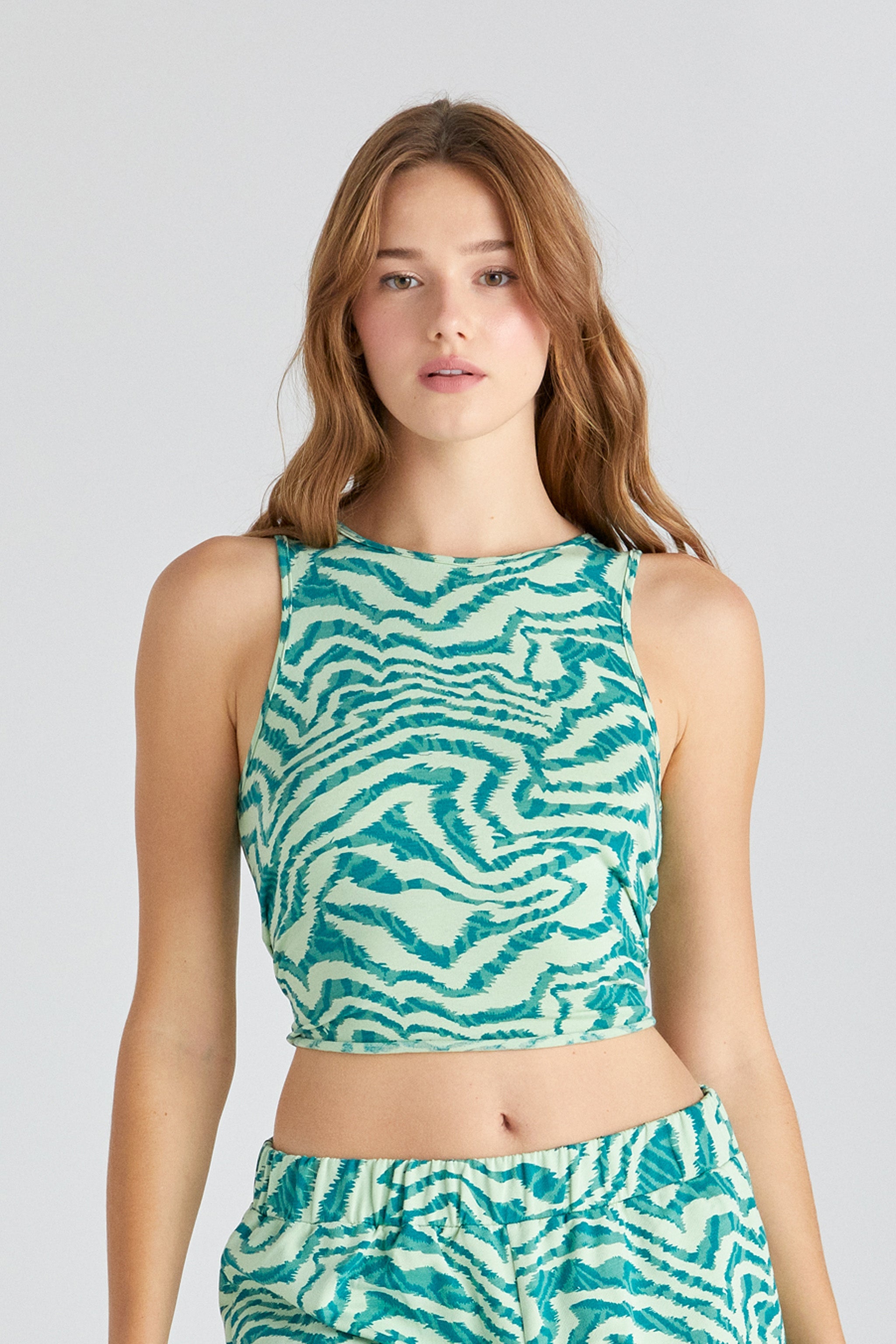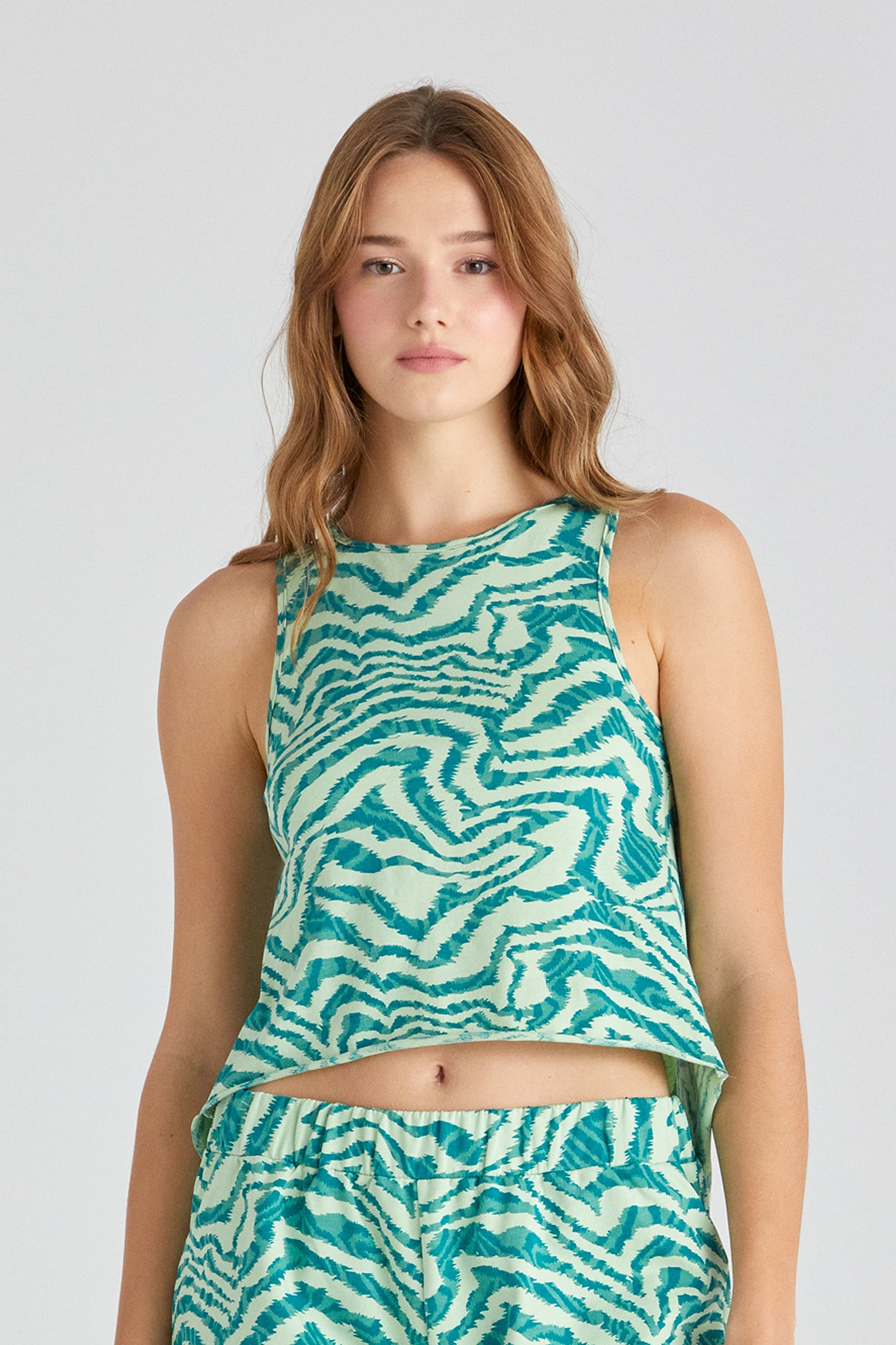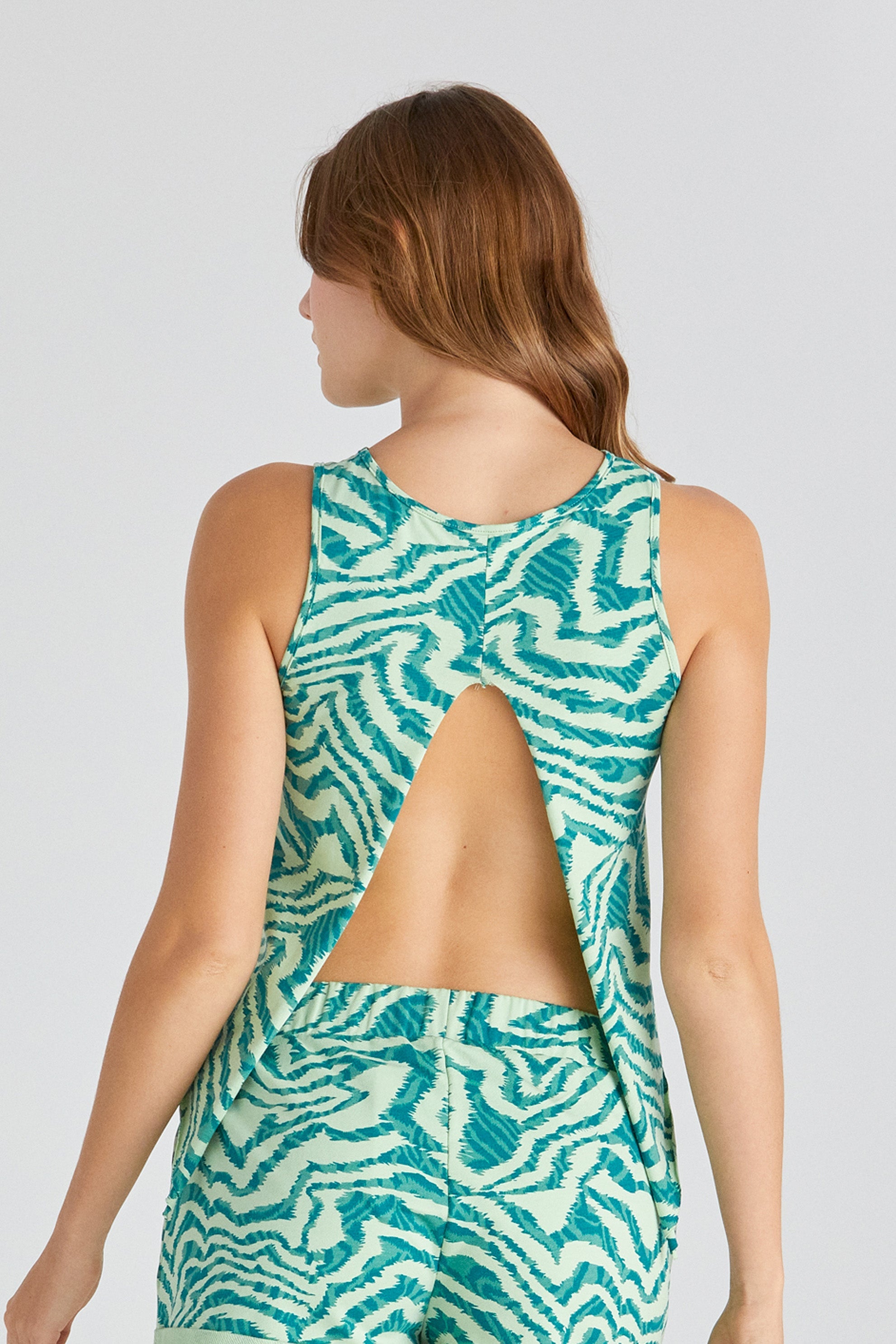 İnce ve ferah kadın kolsuz tişört, yaz sezonunun vazgeçilmezidir. Modelin arka kısmında geniş bir yırtmaca sahip olduğundan açık veya bağlı olarak giyilebilir. Rahat ve şık olan yeşil tişört, %95 organik pamuk %5 elastandır ve tamamı baskılıdır. Bu tişört hoş bir şekilde yumuşak ve kalitelidir.