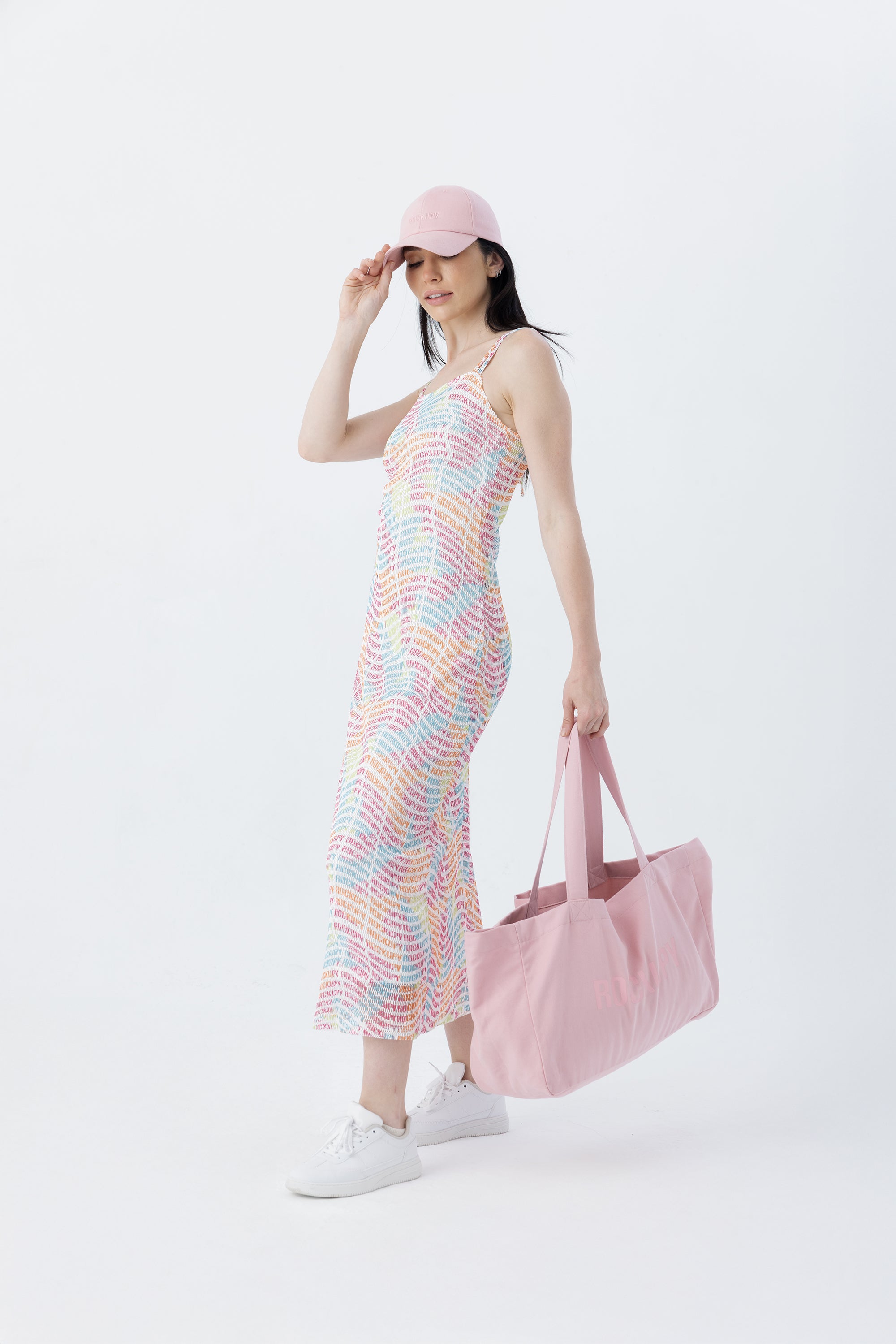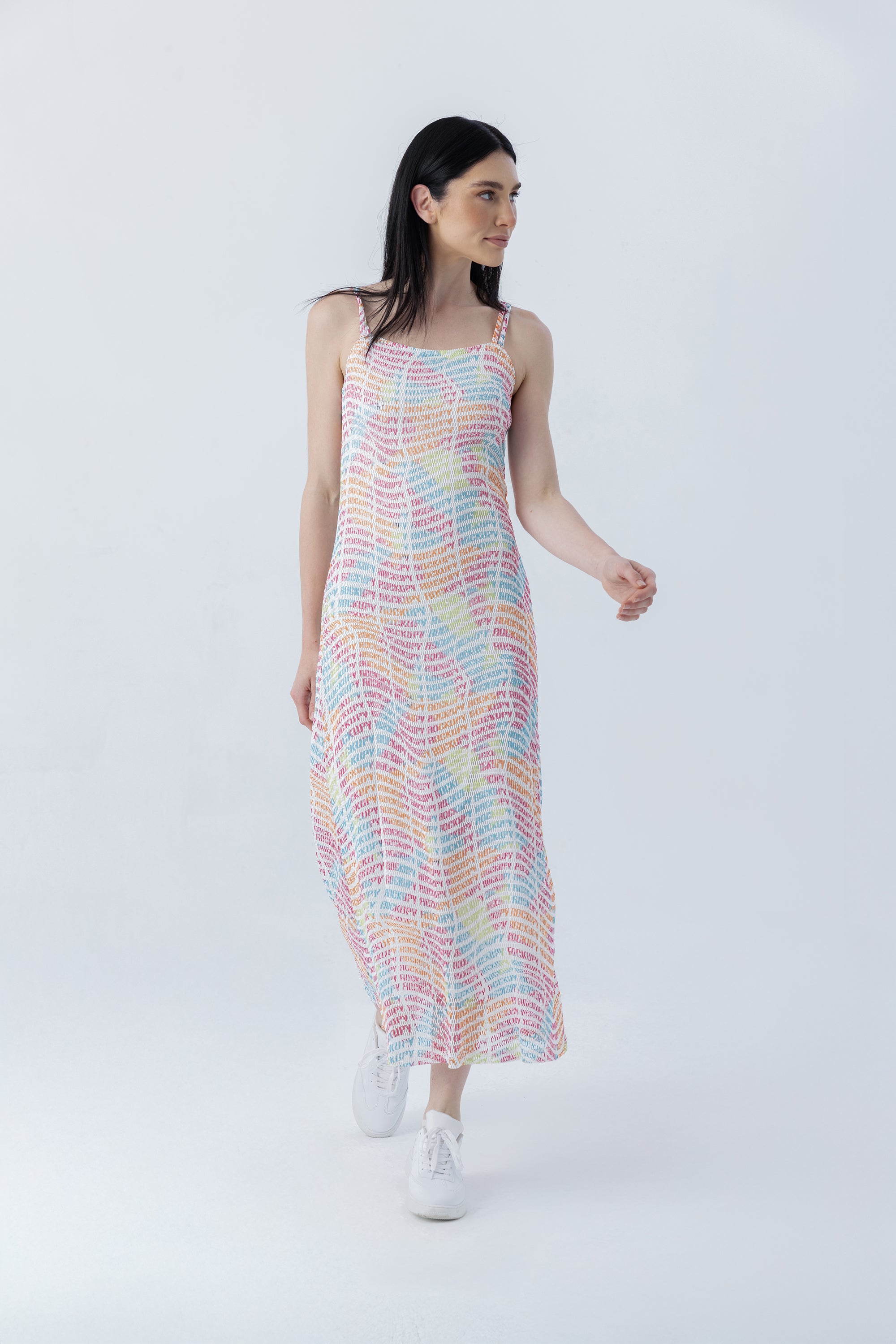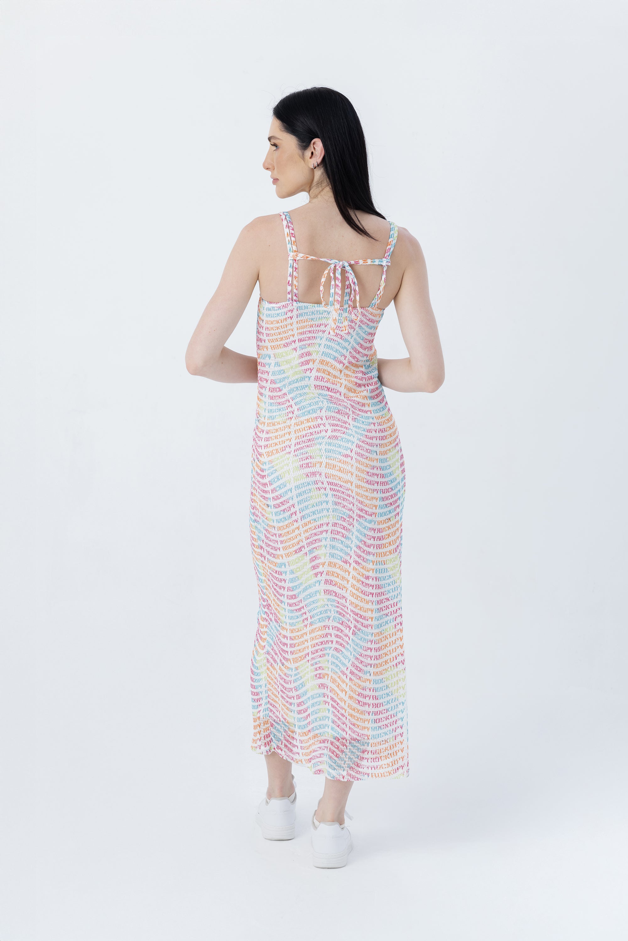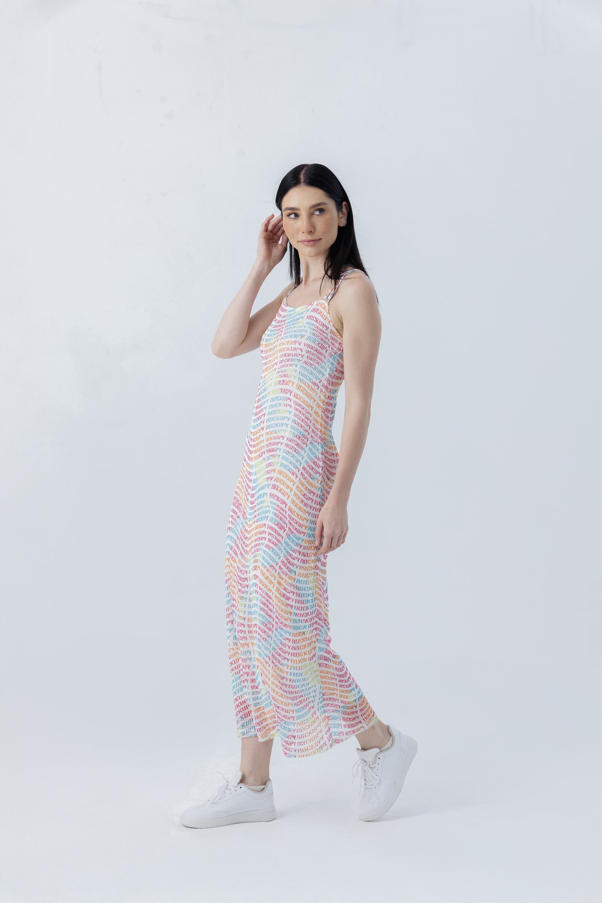 - File kumaştan yapılan yumuşak tuşeli, uzun kadın elbise. Kolları ve sırt detayında bulunan ince askılar. İçerisinde astar mevcuttur. Orijinal marka logosuyla tamamen baskılıdır.