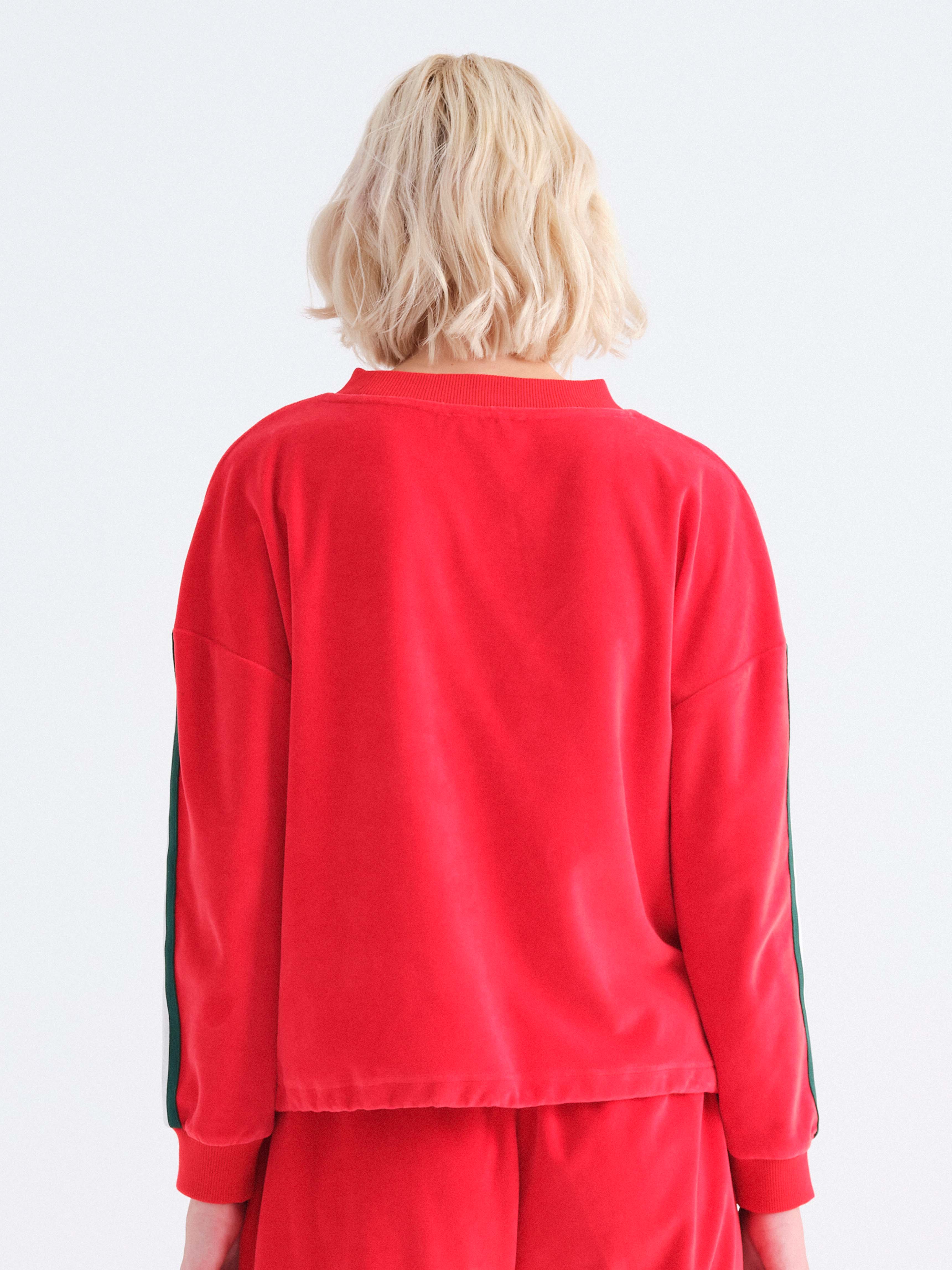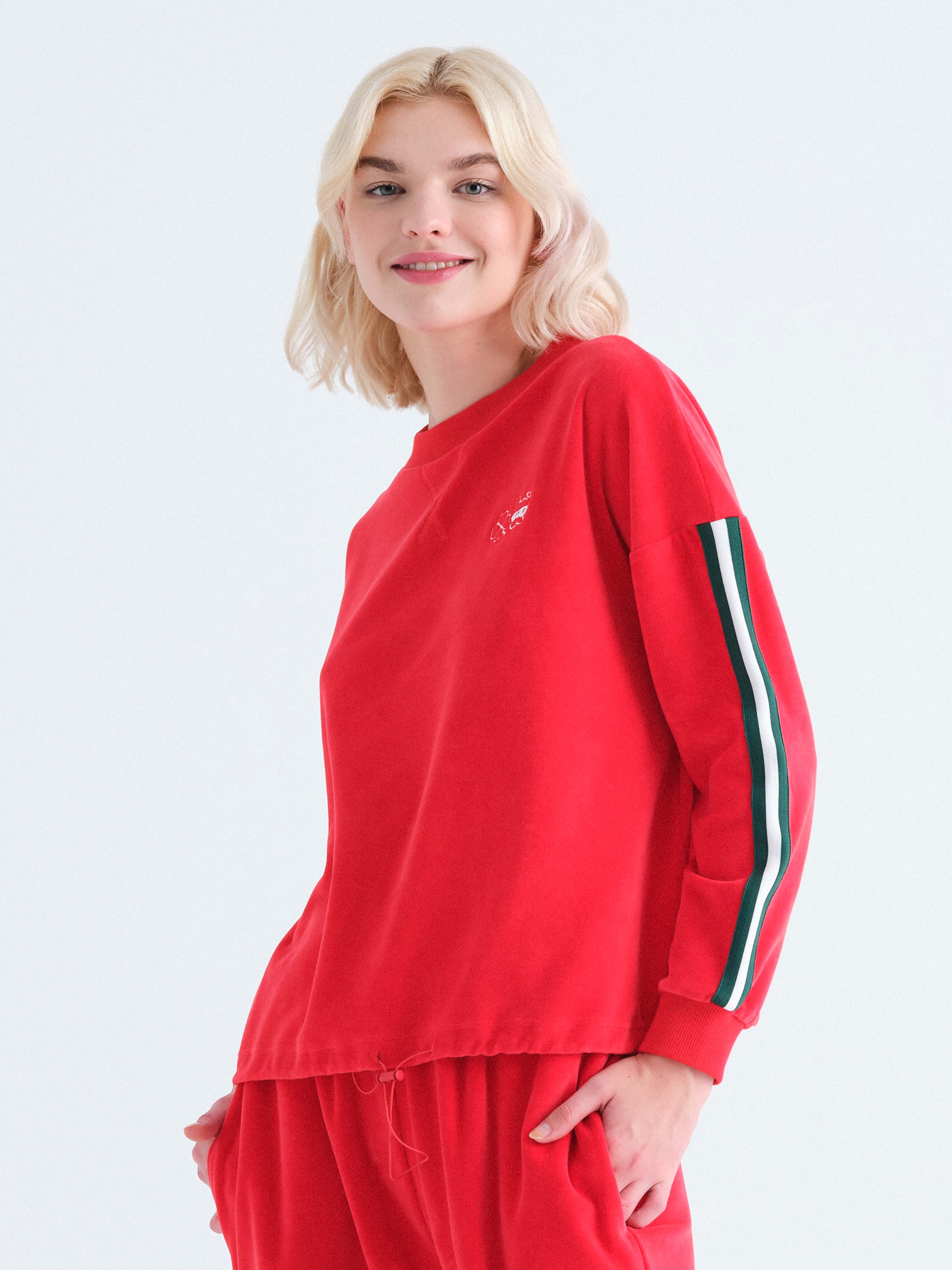 Konfor ve Kullanım: Kadife kumaşın doğası gereği, bu sweatshirt son derece yumuşaktır ve giyilmesi çok rahattır. Günlük kullanımda hem şık hem de rahat bir seçenek sunar.