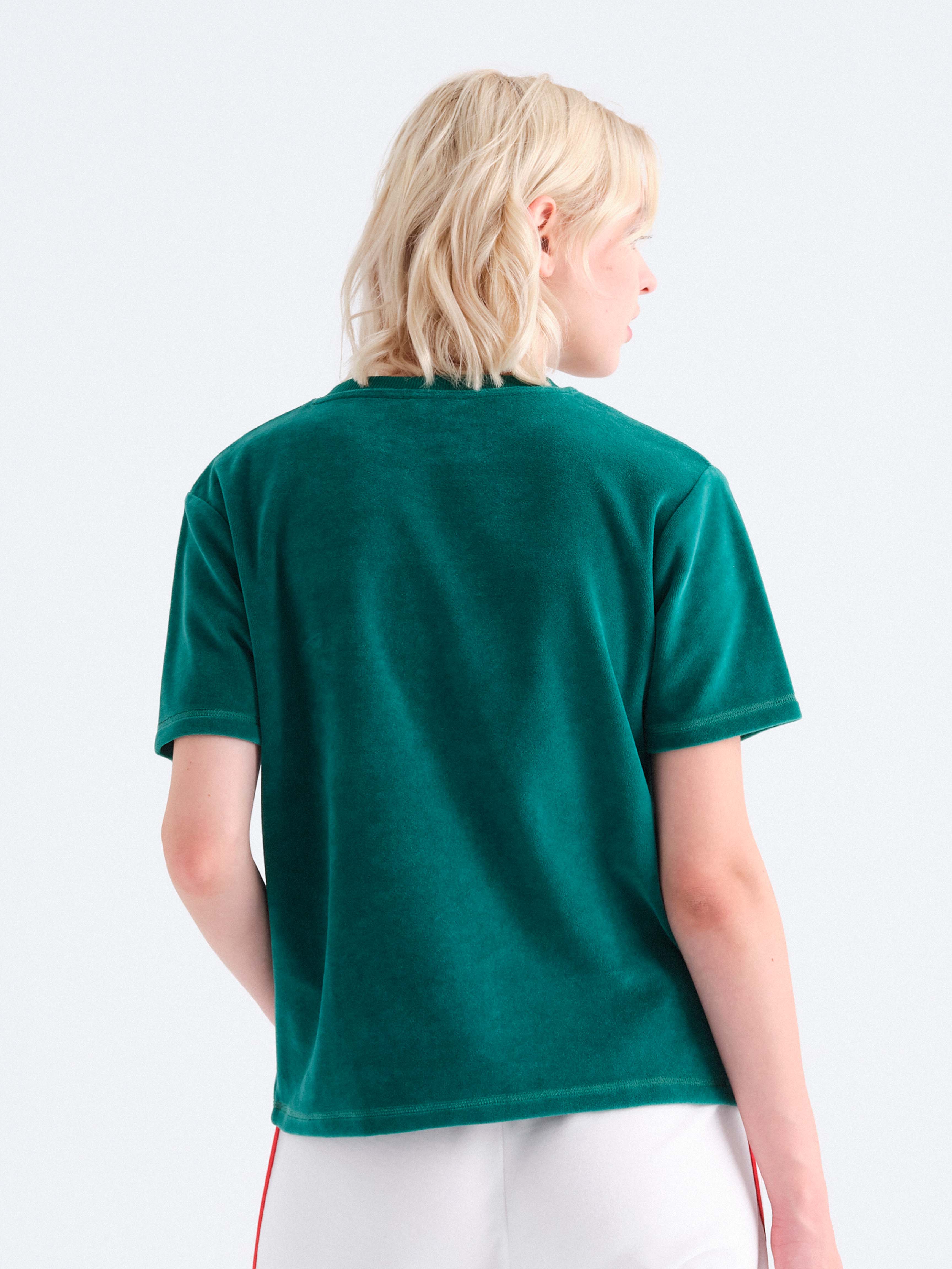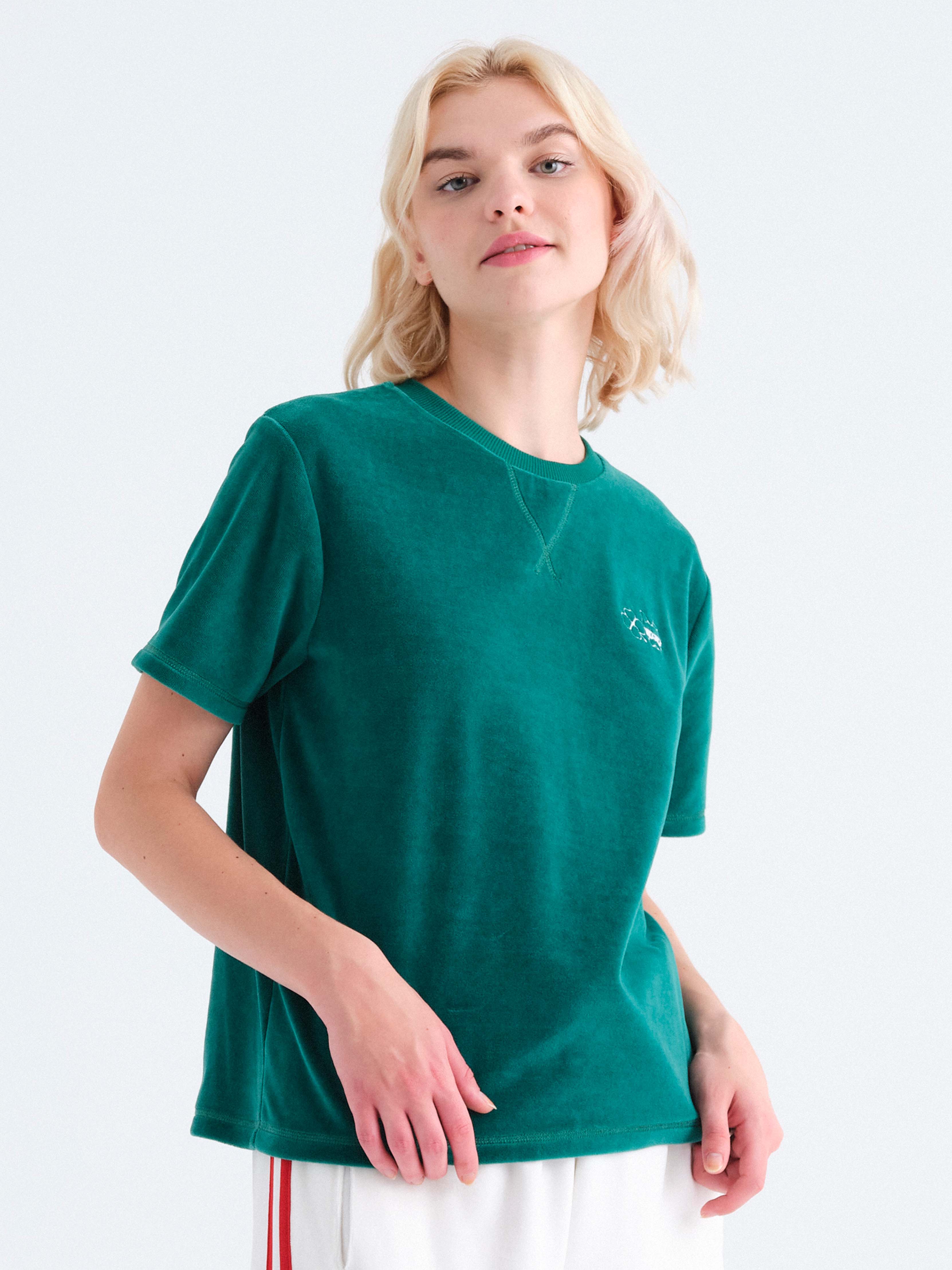 Yumuşak kadife kumaşlı, beyaz orjinal logo ve yonca nakışlı detaylı kadın tişörtü. Tişörtün yakası,...