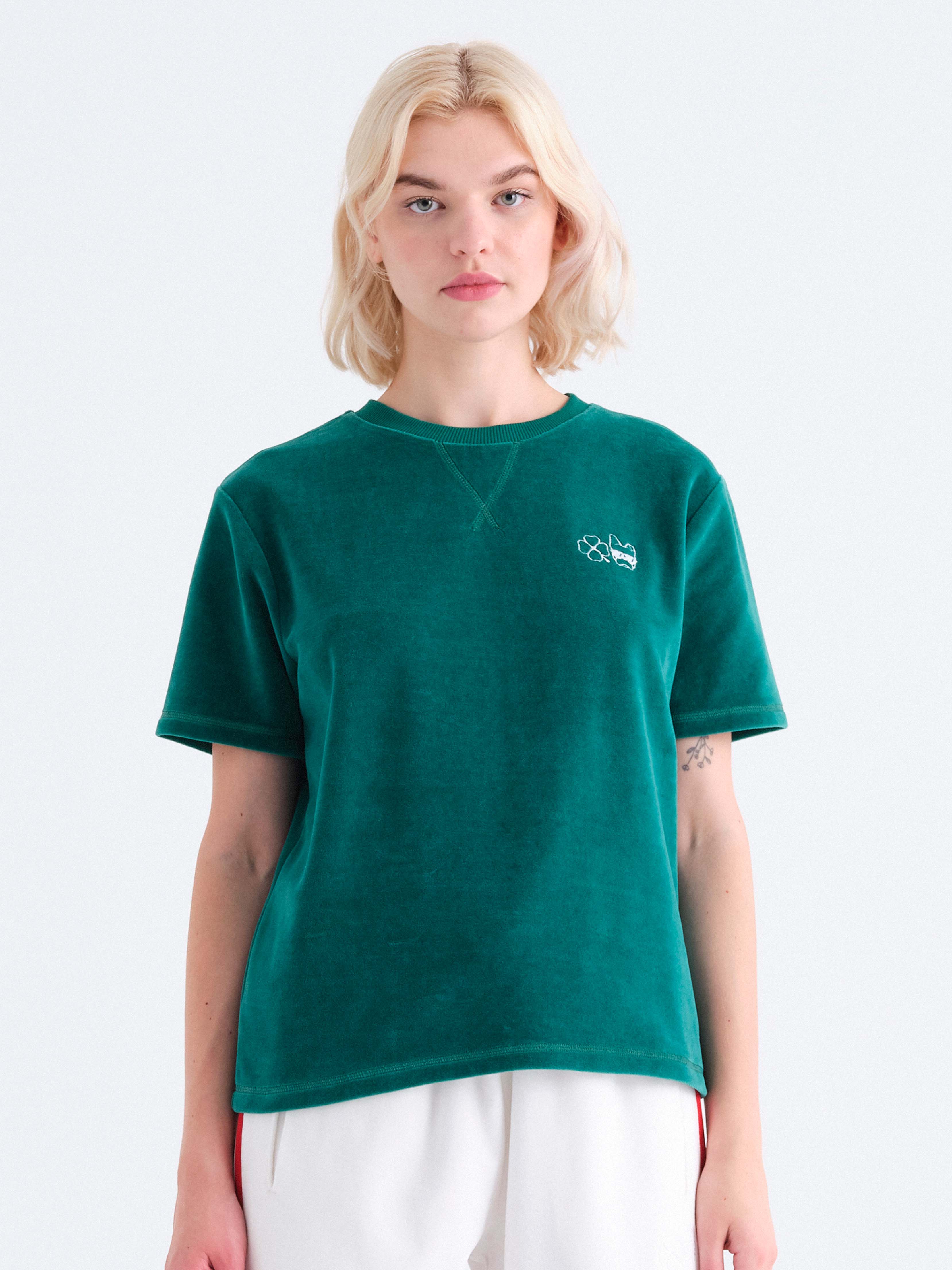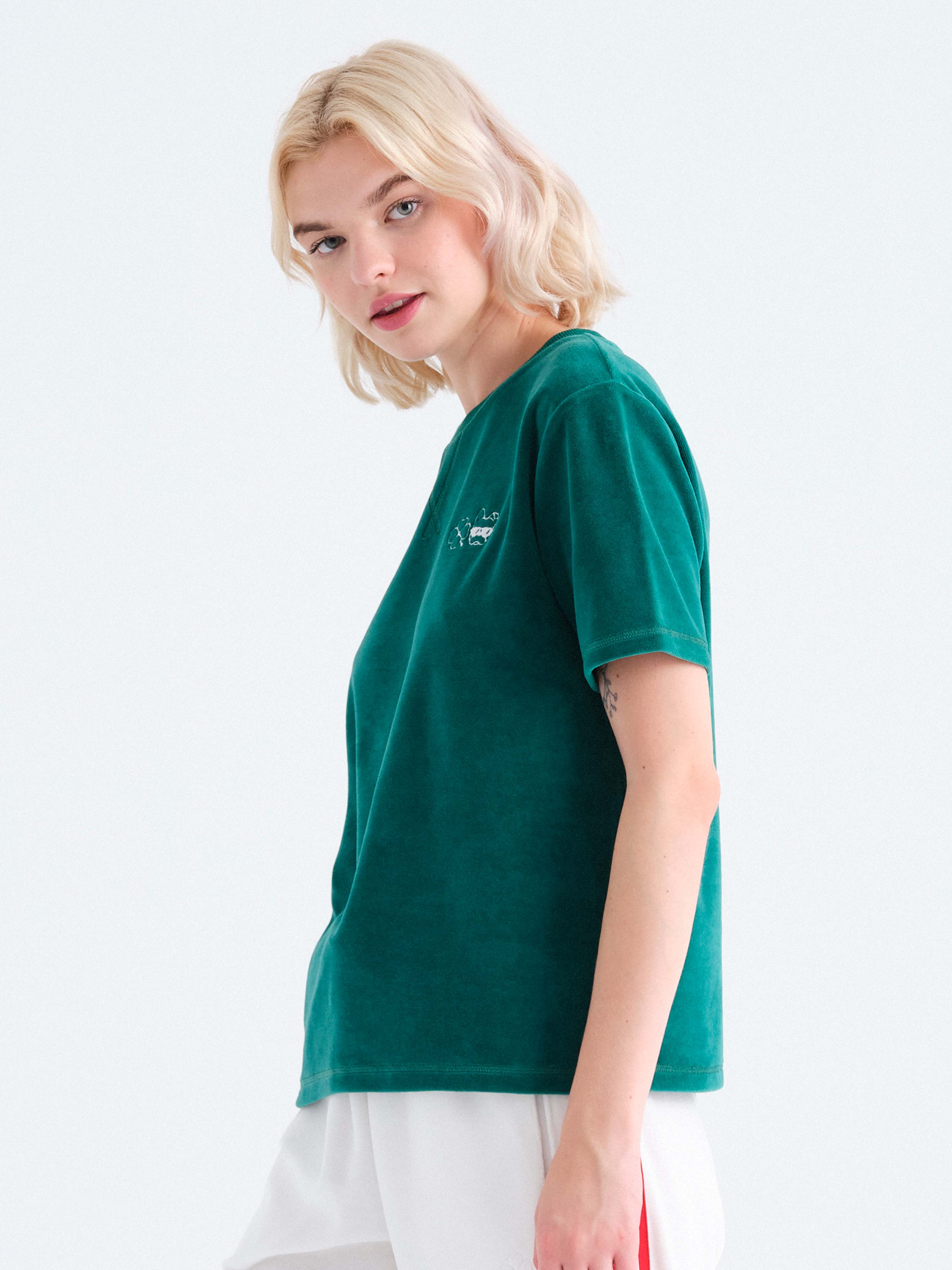 - Yumuşak kadife kumaşlı, beyaz orjinal logo ve yonca nakışlı detaylı kadın tişörtü. Tişörtün yakası, iyi yapıya sahip cotton elastane ribanalı ve yaka hattı ana renkte zikzak dikişli. Kadife kumaşın doğası gereği bu giysi hoş bir şekilde yumuşaktır ve giyilmesi çok rahattır.