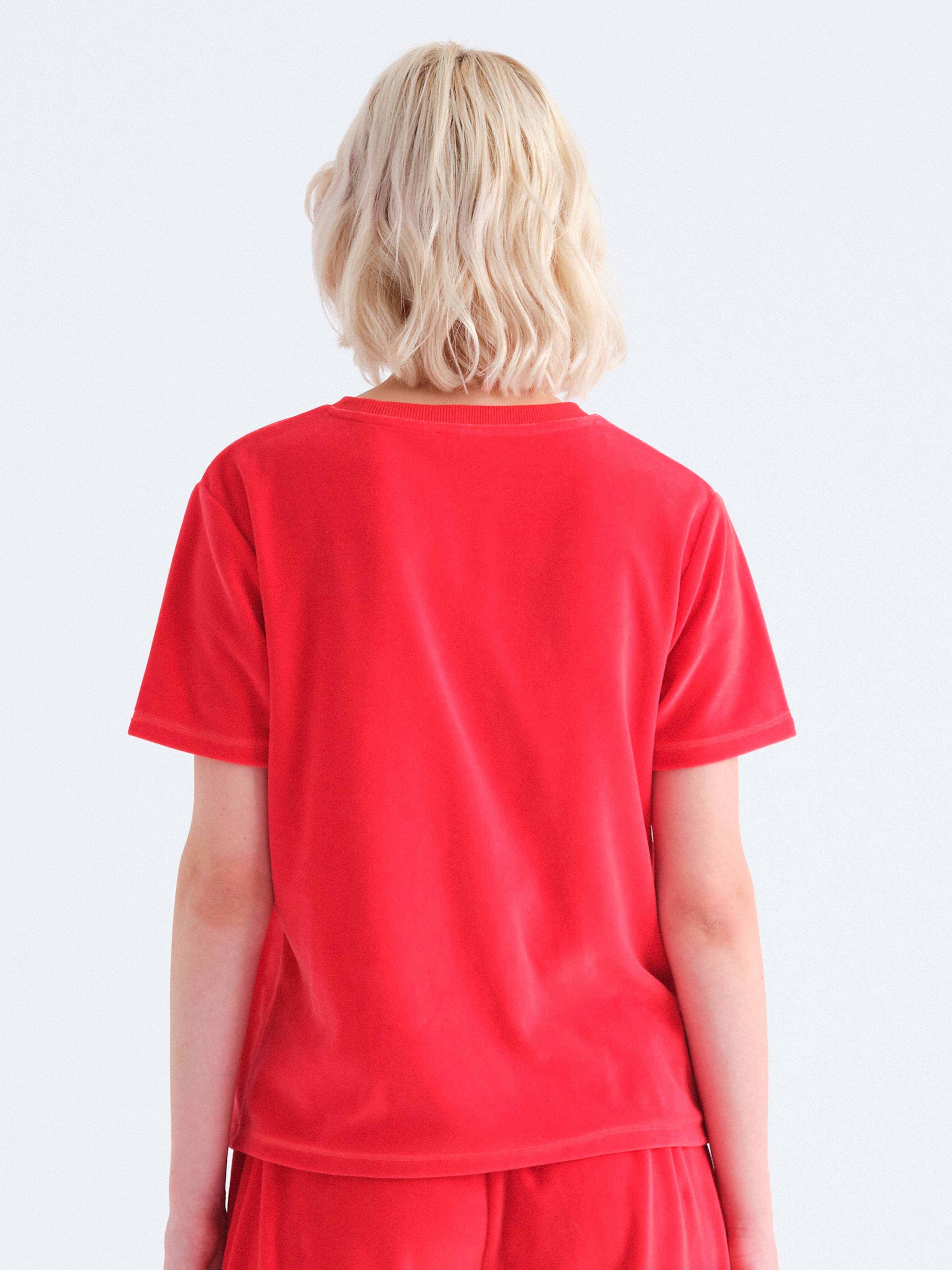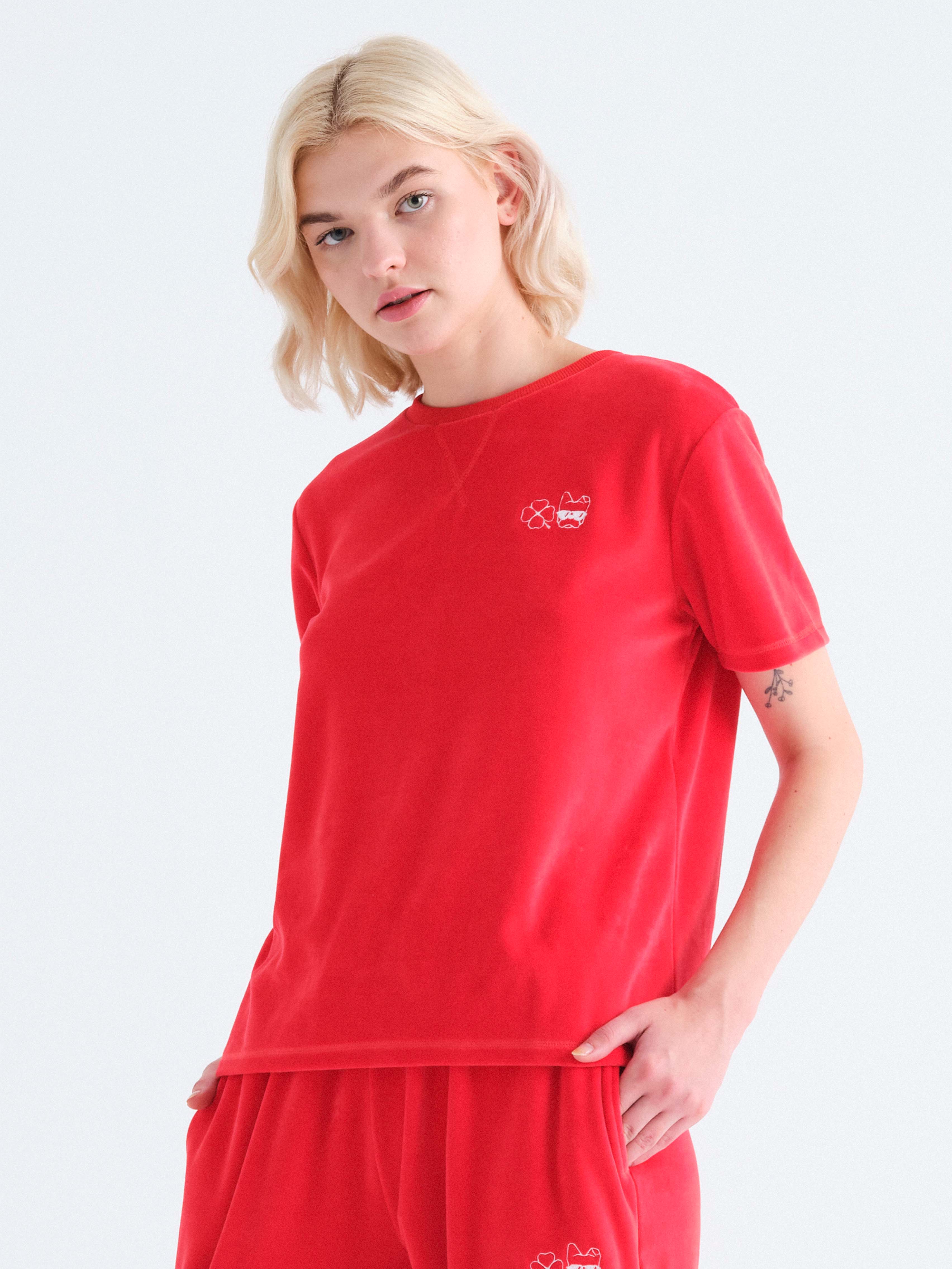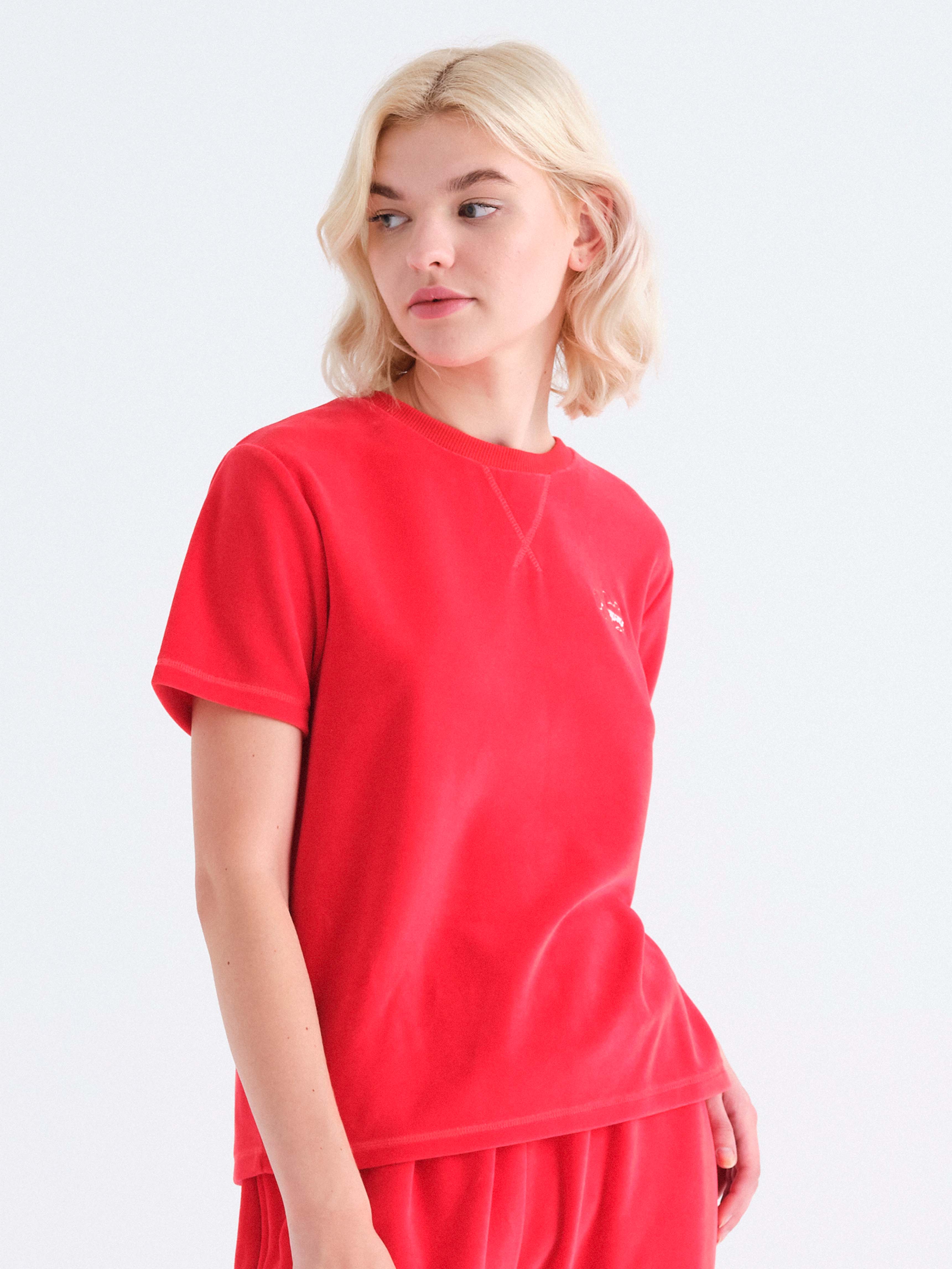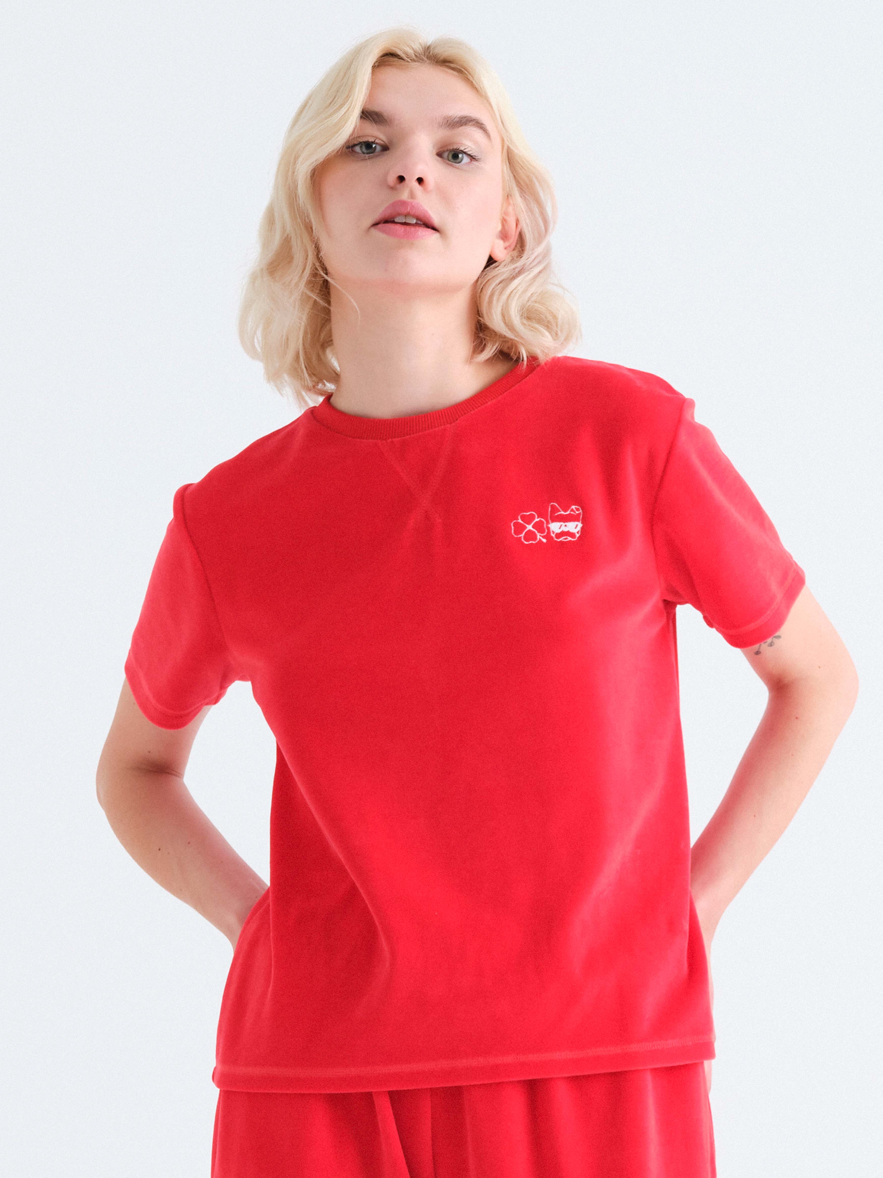 - Yumuşak kadife kumaşlı, beyaz orjinal logo ve yonca nakışlı detaylı kadın tişörtü. Tişörtün yakası, iyi yapıya sahip cotton elastane ribanalı ve yaka hattı ana renkte zikzak dikişli. Kadife kumaşın doğası gereği bu giysi hoş bir şekilde yumuşaktır ve giyilmesi çok rahattır.